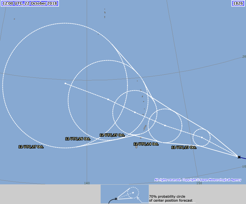 Op de West-Pacifische Oceaan bevindt zich ook een storm en deze kan mogelijk net zo'n monster worden als Willa nu is. De GFS runs lieten de toekomstige typhoon de afgelopen dagen naar rechts afbuigen, maar GFS lijkt steeds meer naar EC te neigen, waarbij de typhoon verder richting het Westen blijft bewegen. Op het einde van de JMA verwachting (25 oktober) wordt een kerndruk van 925 hPa verwacht als een cat 5 supertyphoon. De huidige GFS runs laat de typhoon op 28 oktober nog op tijd wegdraaien terug naar de oceaan. De huidige GFS run daalt tot 890 hPa. Bij EC komt de typhoon nog verder Westelijk te liggen, maar lijkt hij stil komen te liggen en uit elkaar te vallen voordat hij Taiwan kan bereiken. Vooralsnog is de kans dat de typhoon bevolkt gebied raakt klein, maar hoe dan ook is dit er een om in de gaten te houden. Op Yutu na zijn er op dit moment geen andere stormen of disturbances in de West-Pacifische Oceaan.