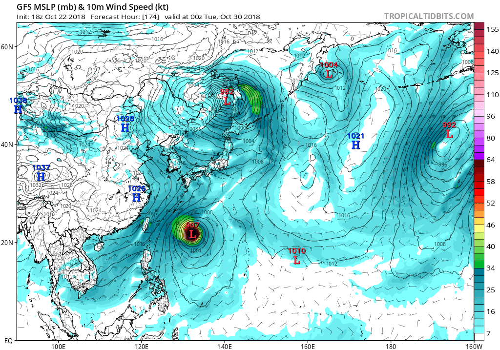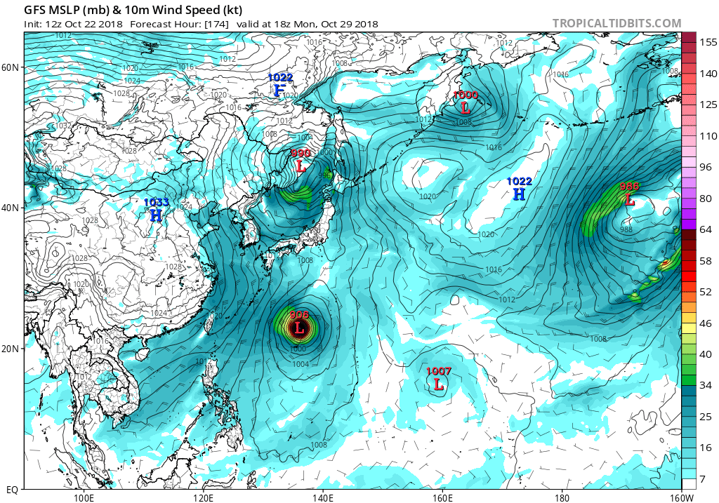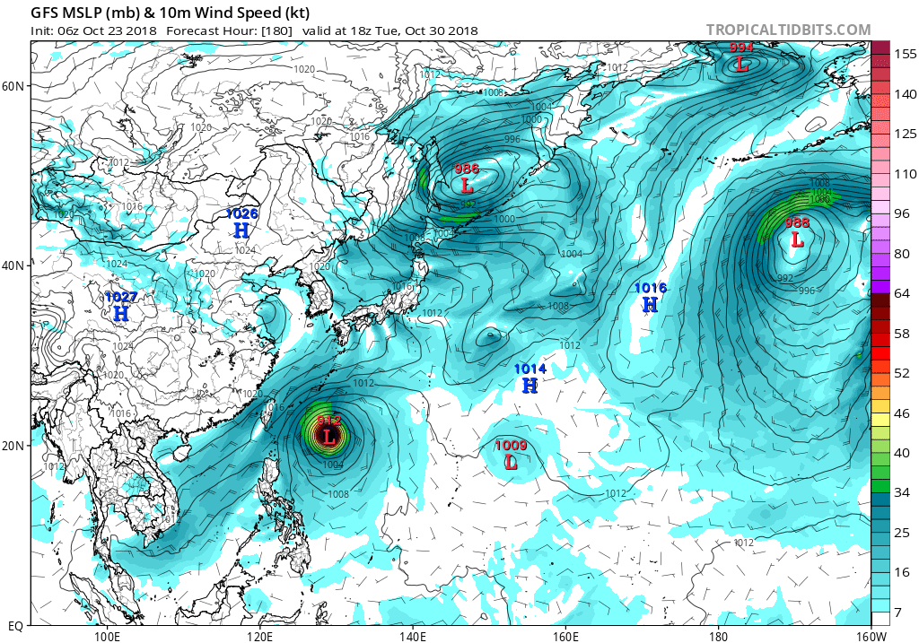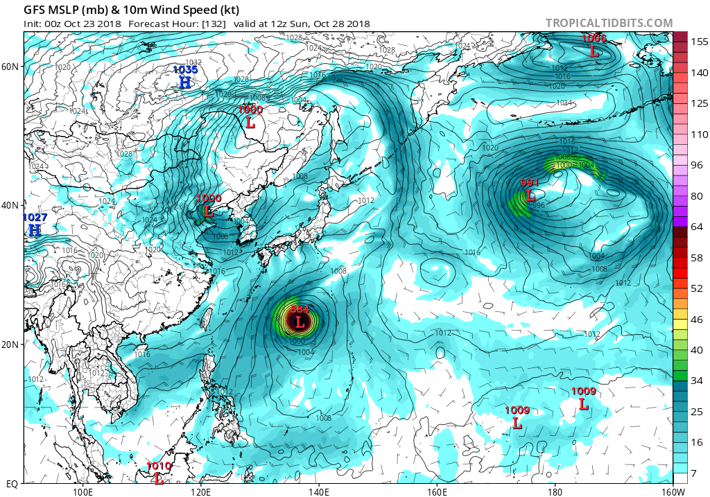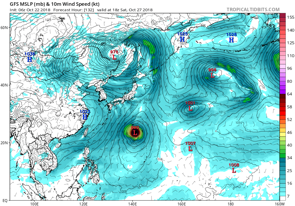 Yutu is op dit moment een cat 1 typhoon met een kerndruk van 965 hPa en windsnelheden van 140 km/h. Verwacht wordt dat Yutu snel zal blijven aansterken en in de avond van 24 oktober Nederlandse tijd als een cat 4 typhoon met windsnelheden tot 210 km/h recht over de Noordelijke Marianen zal trekken. Dat gebied heeft eerder dit jaar ook al last gehad van Mangkhut, die als een categorie 2 typhoon langstrok. Daarna wordt verwacht dat Yutu verder naar het Westen gaat. Oorspronkelijk werd gedacht dat er geen enkel gevaar zou zijn voor andere bevolkte gebieden. Dat is officieel nog steeds zo, maar ik merk dat de afgelopen GFS runs van typhoon Yutu steeds verder naar het Westen gaan. Vooral de nieuwste 06z run komt akelig dicht bij Taiwan. Ik hoop dat het hierbij blijft, maar ik ben er niet gerust op dat de komende runs niet nog verder naar het Westen gaan. Hieronder de meest Westelijke positie van Yutu op de afgelopen 5 runs: