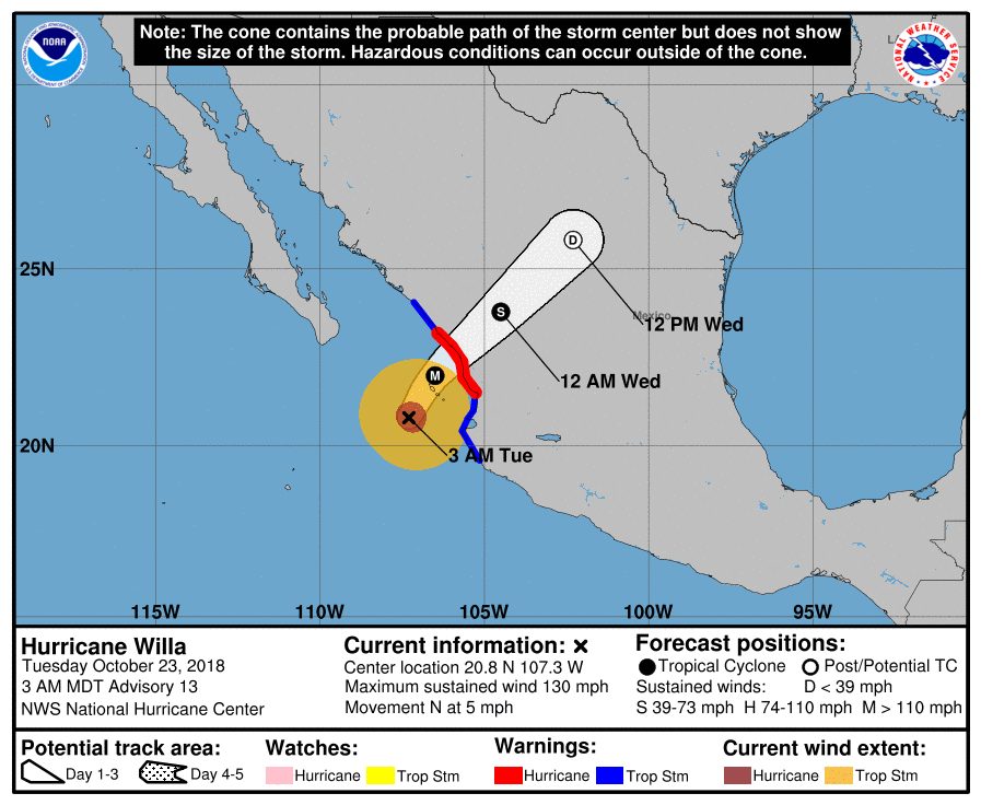 Ondertussen is er ook nog steeds orkaan Willa. Door de Eyewall Replacement is ze afgezwakt naar een categorie 4 met windsnelheden van 210 km/h. Veel tijd om verder af te zwakken is er niet meer. Waarschijnlijk zal ze een beetje afzwakken naar een categorie 3, maar een major hurricane landfall lijkt zeer waarschijnlijk. Over 2 à 3 uur wordt verwacht dat Willa aankomt in Mexico.