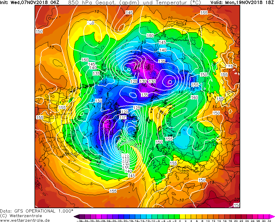 Op deze kaart is fraai te zien dat de warme lucht behoorlijk noordelijk komt. Op de Oceaan ontwikkelt zich een diepe depressie.