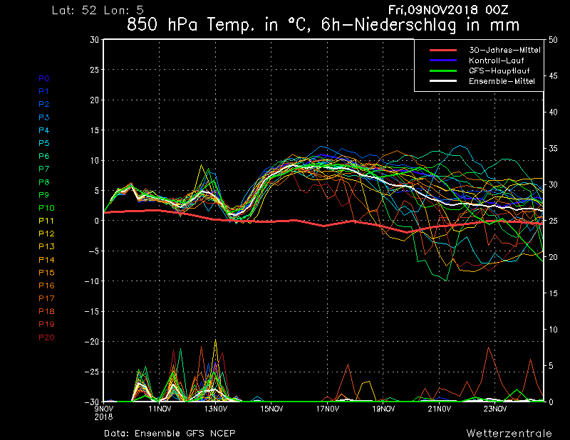 Later in de periode gaat de 2meter temperatuur logischerwijs dalen want continentale aanvoer kan niet eeuwig warm/zacht blijven, zelfs niet uit zuidelijke richtingen. Maar de afwijking op 850hpa spreekt wel weer boekdelen, zou die in spiegelbeeld staan dan waren we al vertrokken voor een relatief zeer koude periode. Ik zie nergens dat 75 % van het ensemble voor ooststroming gaat op termijn (Seppie?). Ik zie überhaupt nog weinig lichtpuntjes aan de horizon voor winters weer. Wat ik wel zie is weer een aantal heerlijke herfstdagen. Ik teken ervoor