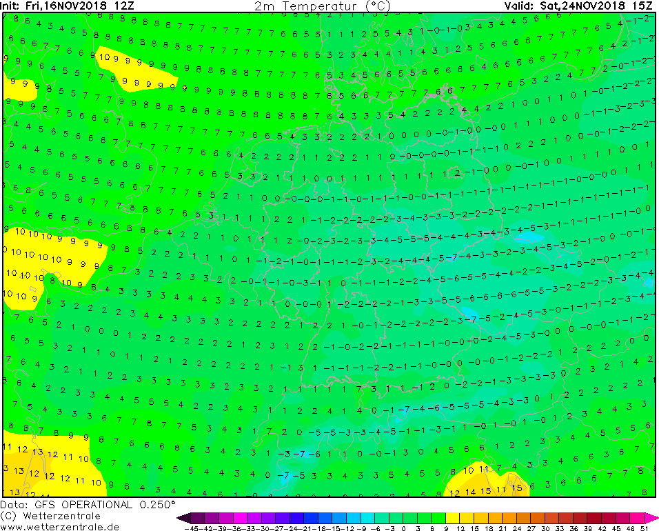 Net boven 0°C (kortstondig wellicht 2°C als max) met een relatief 'milde' zuidooster. De zuidoostelijke uitloper verhindert dat de diepe kou tot bij ons komt. dit is voor mij echter ook al OK als de minima richting -5°C gaan.