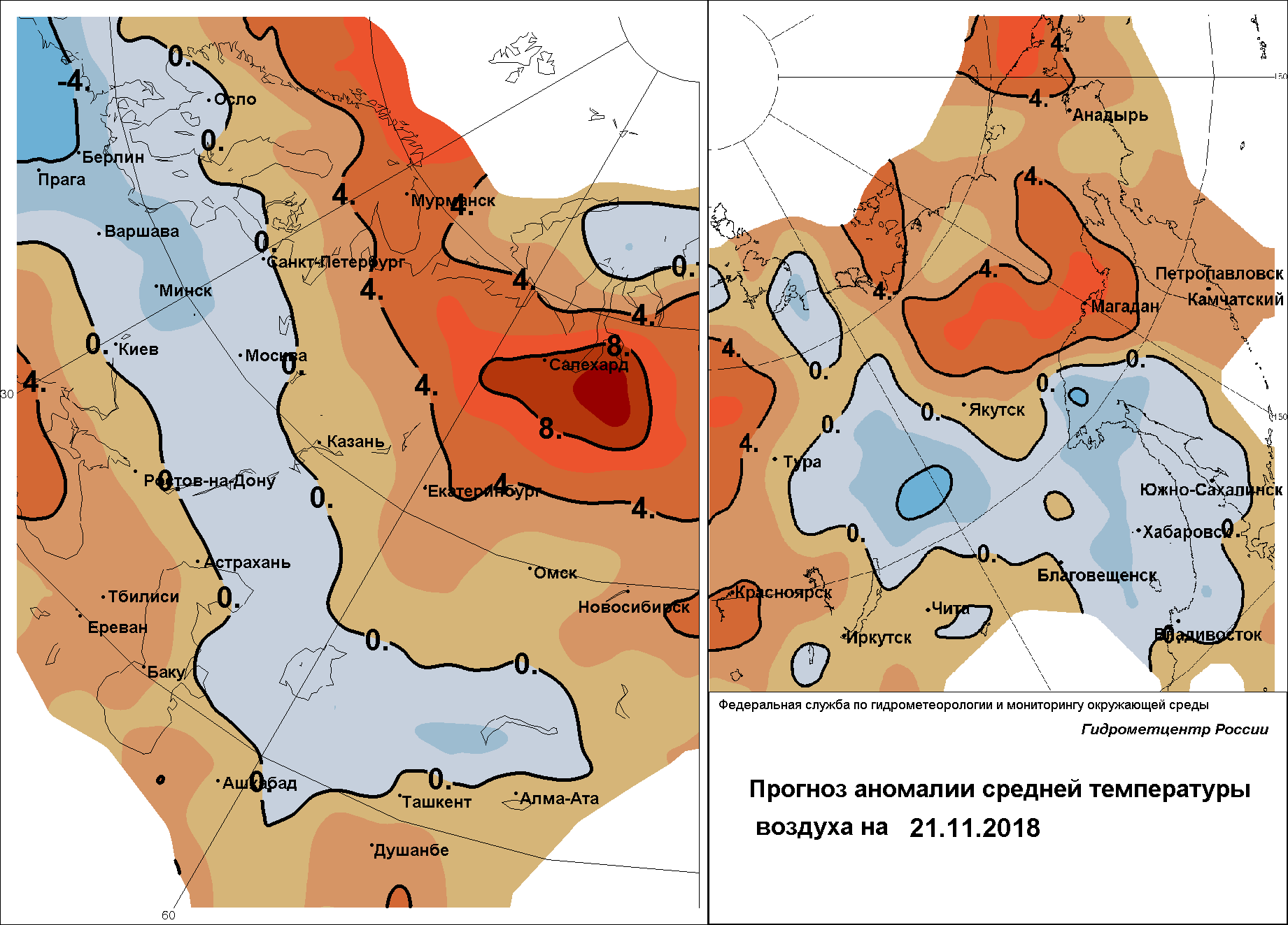 Kaartje: verwachte temperatuurafwijking 21 november.