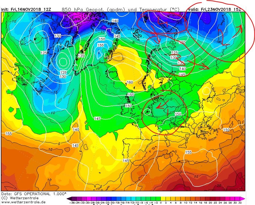 Zoals de uitloper en nu ook de zonaliteit ten noorden van het hoog vind ik opvallen nu. Je ziet dat 'onze' arctische kou inmiddels op transport gaat naar Kazachstan (2). Tweede koufront is inmiddels getransformeerde maritiem polaire lucht en best zacht door die depressie die nog bovenlangs trekt (3). Daarachter kan pas een nieuw transport van arctische lucht op gang komen. Intussen ligt de kou uit de eerste 'uitbraak' komende maandag (1) nog boven midden Europa met weinig stroming, bewolking en af en toe wat neerslag.