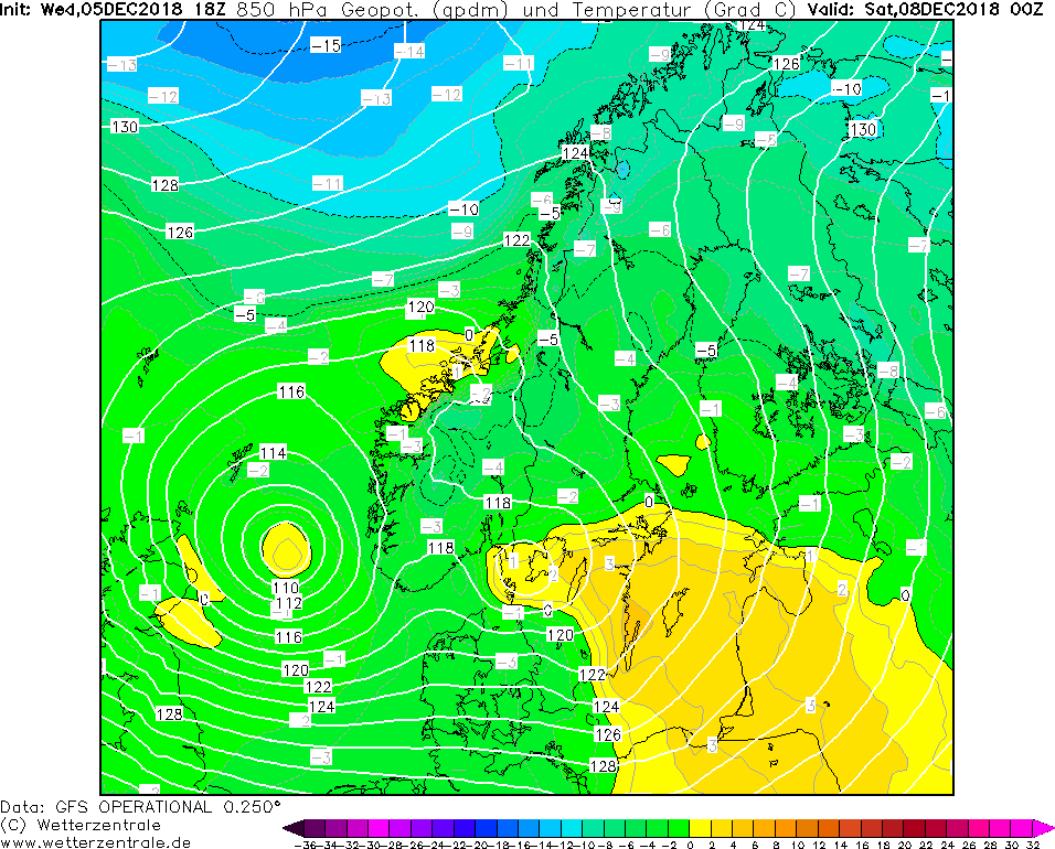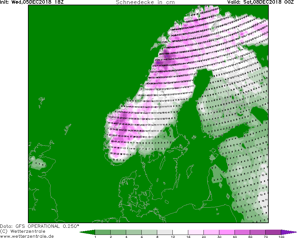 GFS geeft een sneeuwdekje in ZO-Noorwegen maar de kans lijkt me klein als ik de bovenluchttemperaturen bekijk (meest tussen 0 en -2 tijdens de neerslag).