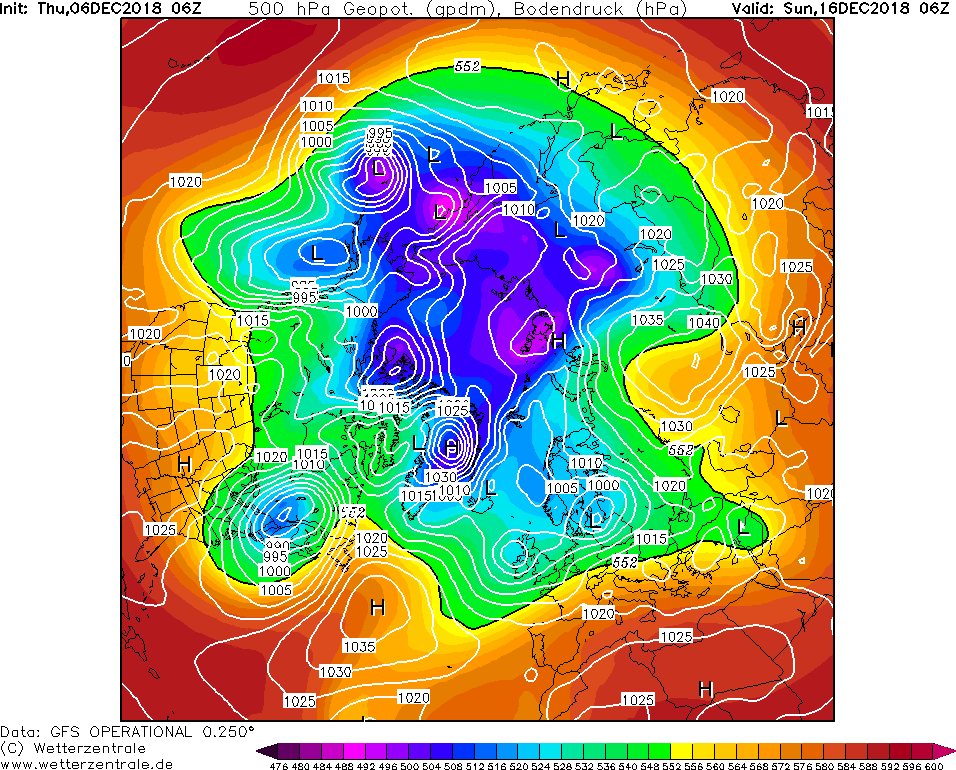 Blokkade is opgeruimd en een zwakke trog boven Scandi resteert. Op de oceaan is het vrij rustig en bestaat een kans op nieuwe WA. Zoals verwacht zit het meeste paars in de Russisch-Aziatische sector en de meeste depressieactiviteit rond de Aleoeten.