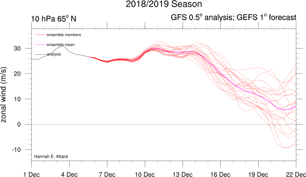 Voorlopig zie ik in de observaties en voorspellingen een normale gang van zaken, waarbij er inderdaad een redelijke puls op komst is. Daarbij hebben we het wel over een termijn waarin de modellen bewezen onbetrouwbaar zijn en kijken we veelal naar afwijkingen in de orde 1-2 standaard afwijkingen. Ik zou dus nog niet te gretig zijn met termen als 'heel krachtig', ik zie op het maximum in de GFS berekening een 10hPa temperatuur rond -20. Dat is een flinke afwijking, maar klein bier vergeleken met pulsen die in het verleden een major SSW hebben veroorzaakt (dat gaat eerder naar de +20). In het ensemble zie ik veelal een minor SSW, met een afname van de zonaal gemiddelde zonale wind op 60N naar ~10m/s en een enkel lid dat <0 gaat. De vortex krijgt dus een deuk(je), maar voorlopig ben ik nog niet erg onder de indruk.