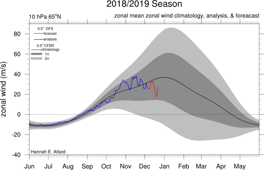 Ik wil vooral even een kanttekening maken bij hoe er de laatste tijd naar de stratosfeer gekeken wordt. Wat bij de discussies achterwege gelaten wordt is dat de huidige variatie in de polaire vortex volstrekt normaal is. Zolang er een cyclonale stroming in de troposfeer en stratosfeer heerst, zullen quasi-stationaire Rossby golven opwaarts propageren en breken. Indien deze een voldoende grote amplitude hebben leidt dat tot een verstoring van de vortex, waarna deze zich weer herstelt.