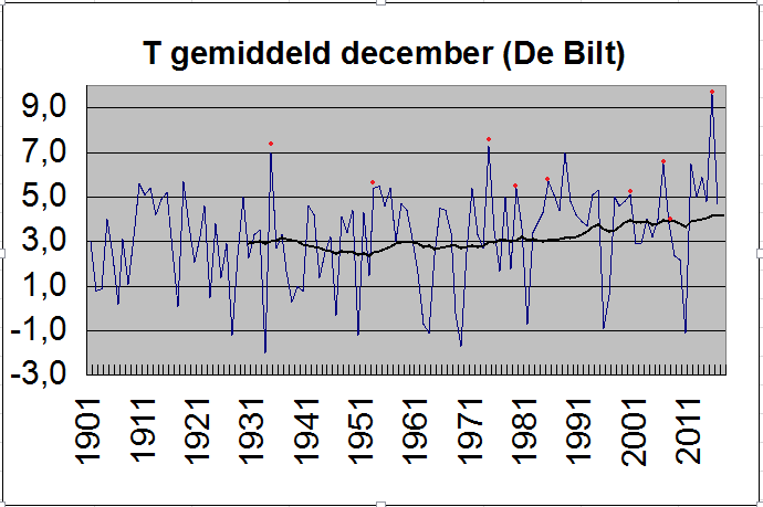Toch zie je wel een duidelijke toename. Voor de duidelijkheid: de rode stipjes staan bij het betreffende jaar waar Sebastiaan over bericht. De temperaturen betreffen de hele decembermaand. 2018 is nog niet aangegeven.