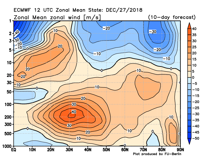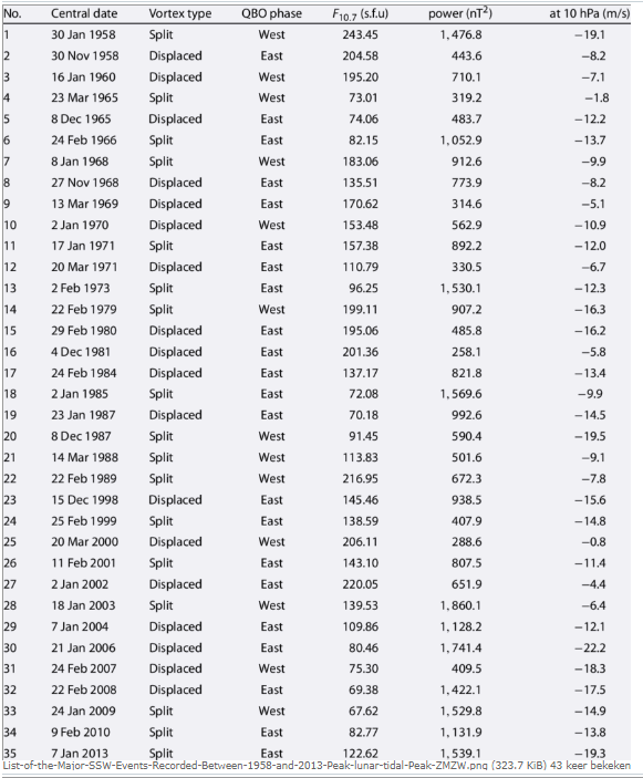 Gisteren nog zo'n 8-9 m/sec op 60NB/ 10 hPa, nu ongeveer 5. Morgen voor het eerst een SSW bij EC in beeld? Laten we desondanks niet té hooggespannen verwachtingen hebben, want in de lijst met SSW's (dank aan Paul, Odijk) komen genoeg jaren voor die het winterhart niet sneller deden kloppen.