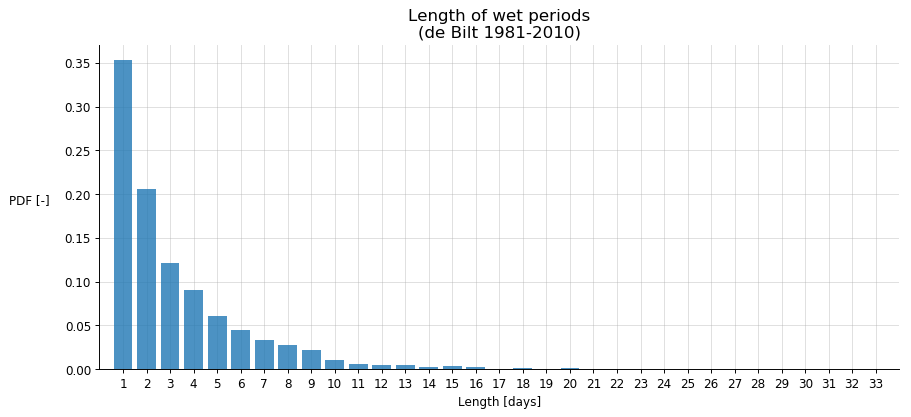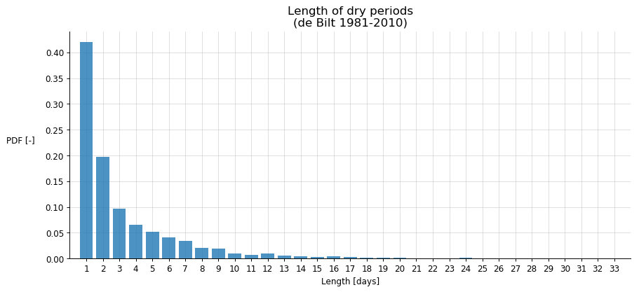Dit zijn de empirische verdelingen van de Bilt (1981-2010) voor droge en natte periodes, en beide apart. Ik heb dagen met minder dan 0.05 mm neerslag als droog beschouwd. In alle gevallen is een lengte van 1 dag wel het meest waarschijnlijk. De langste periode (voor deze jaren) was een droge reeks van 4 april 2007 tot en met 6 mei 2007.