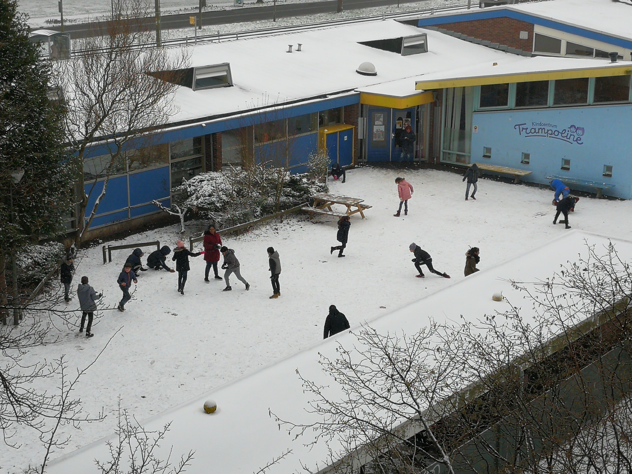 Ouderwets sneeuwballengevecht op het schoolplein! Inmiddels droog en