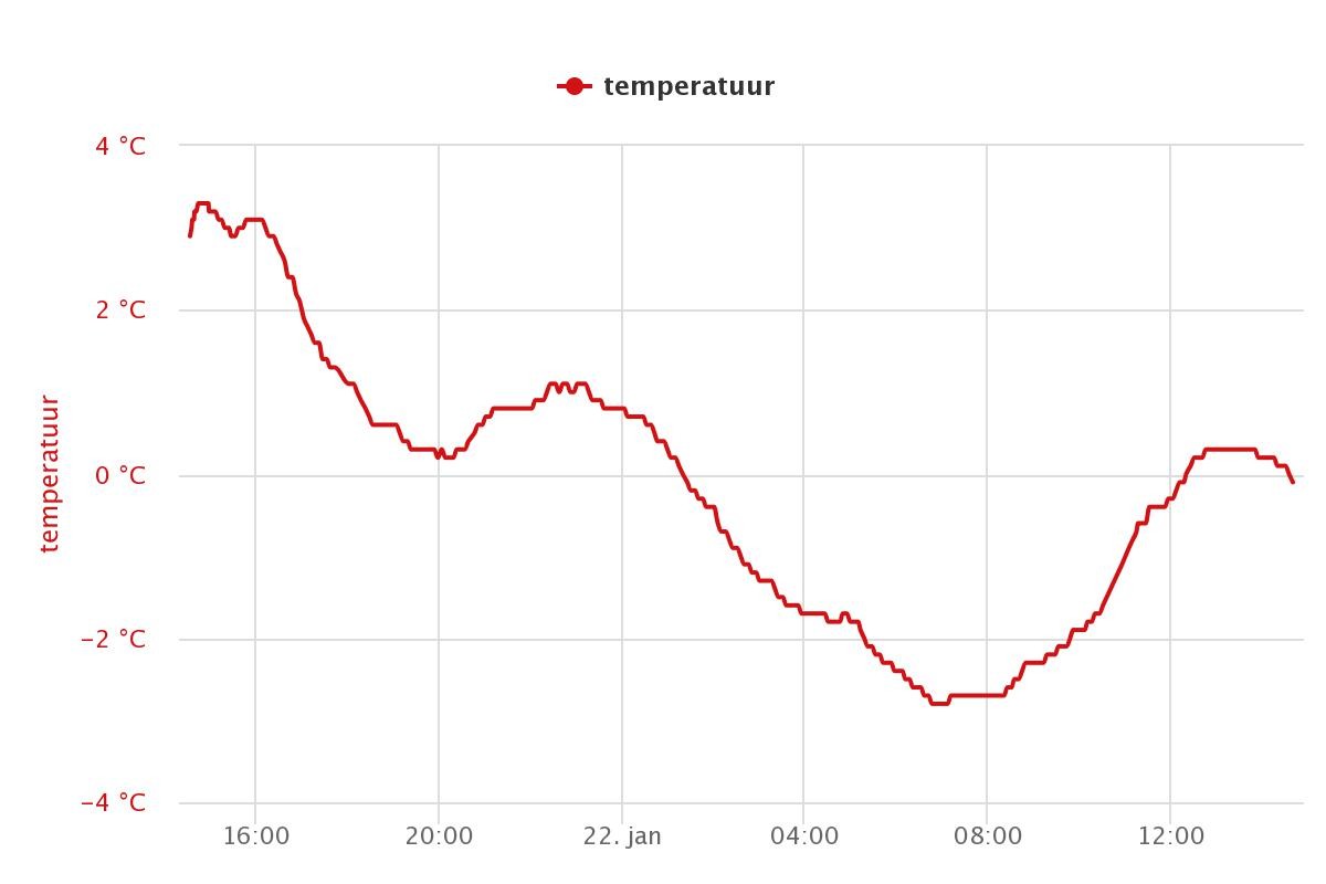 Lichte sneeuw. 1 cm al binnen. Tact: -1,1°C. Tx:-0,5°C.