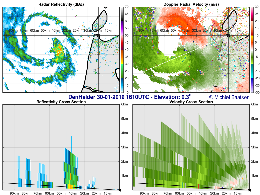 Tsja, als ik zo de individuele scans bekijk begint dat laagje er al snel behoorlijk indrukwekkend uit te zien; scherp gekromde banden met deels convectieve neerslag neerslag, toenemende echo's en een horizontale circulatie van ~10m/s uit de Doppler beelden;