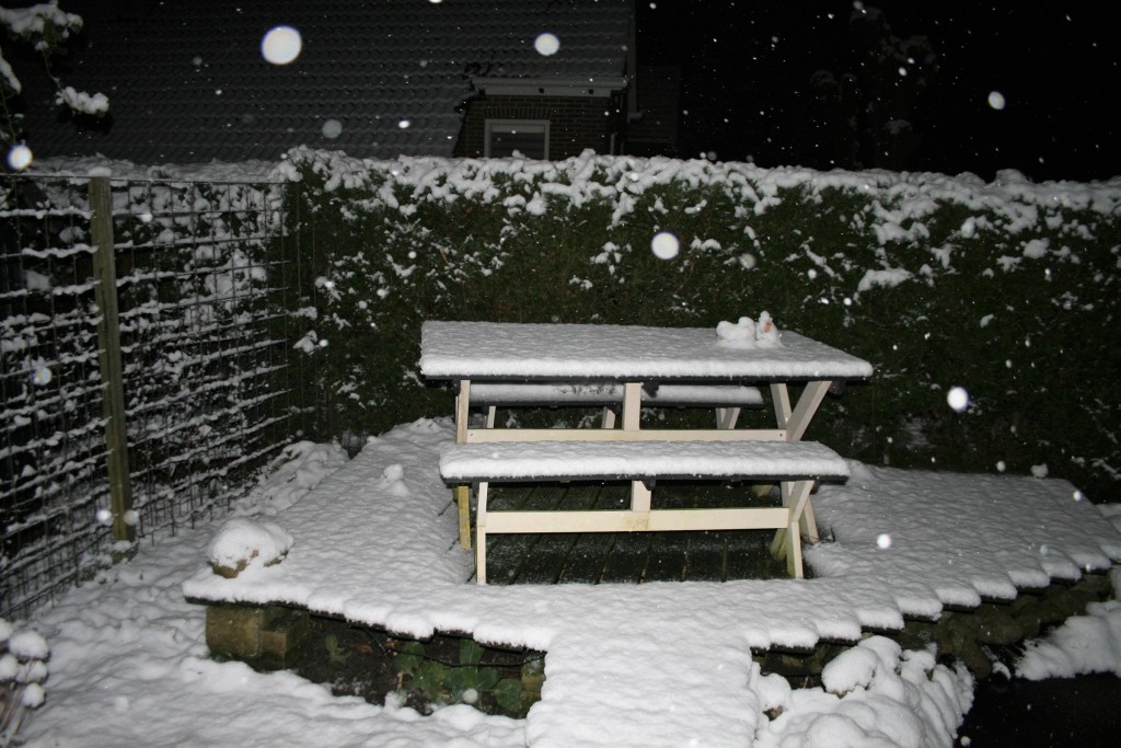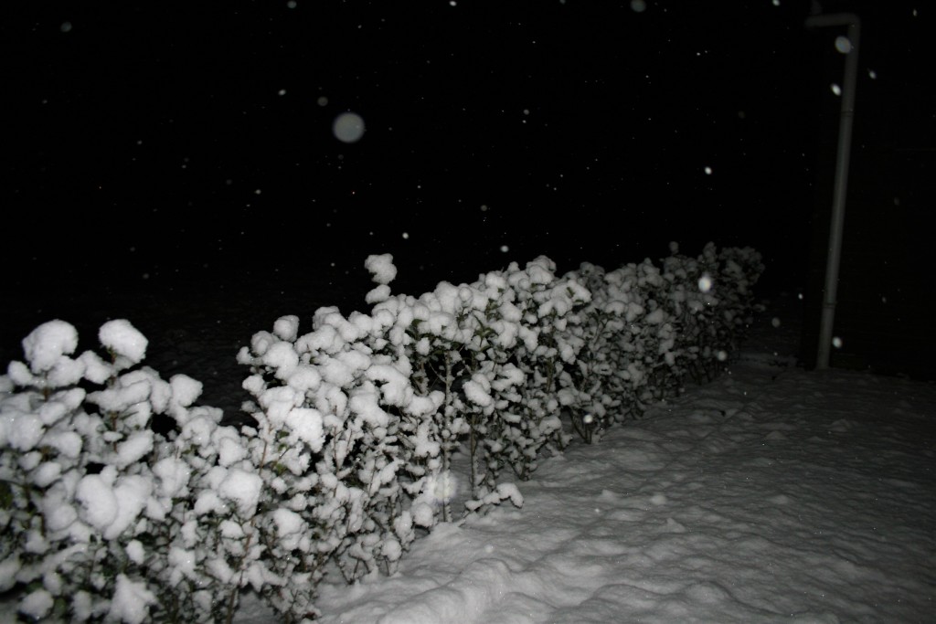 Zo luchtig was de sneeuw van gisteravond. De grote vlokken waren daar debet aan. Je kunt ook aan de sneeuwlaag zien dat het heel snel een beetje wegdooit ondanks de lichte vorst aan de grond.