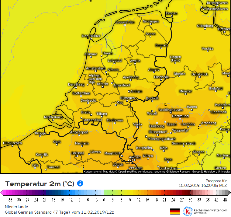 ICON komt zelf niet verder dan ongeveer 15°C bij Aken; hier de berekende temperaturen om 16 uur.
