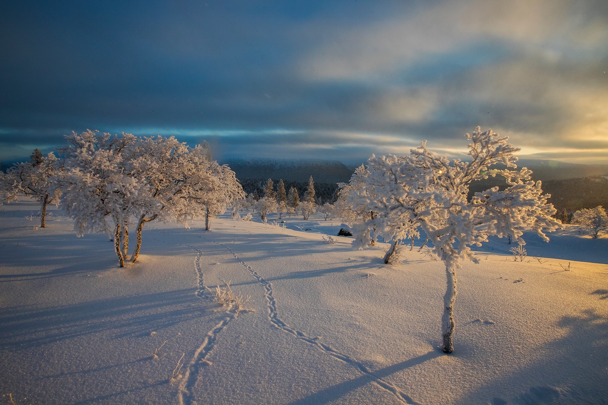 Zo vroeg op het seizoen plakken de bomen nog vol sneeuw en zijn er vrijwel geen mensen in dit enorme nationale park. Dat betekent ook vaak zwaar 'sporen' door een dikke laag koude poedersneeuw, kan fysiek behoorlijk uitdagend zijn