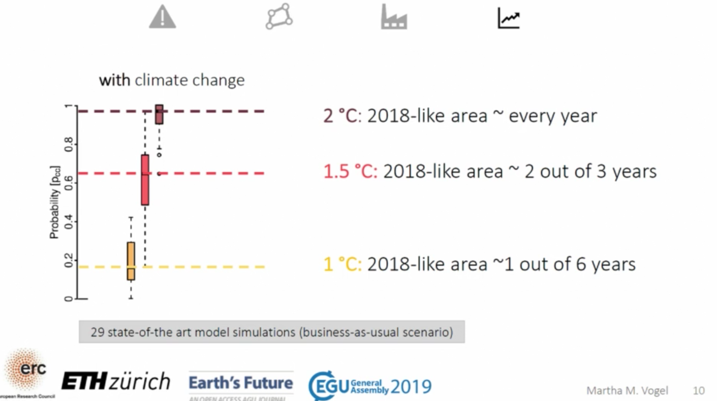 Seneviratne: We zijn niet gestopt bij een analyse van de hittegolven van 2018. Op basis van alle beschikbare data hebben we een reeks computersimulaties gedaan, met broeikasgas als voornaamste variabele. Het resultaat was opzienbarend. Als de gemiddelde temperatuur 1 graad stijgt boven het pre-industriële niveau, is de kans op een extreme zomer zoals die van vorig jaar 10 procent. Als de opwarming anderhalve graad bedraagt, krijgen we er tijdens een op de twee zomers mee af te rekenen. En bij een stijging van 2 graden wordt dat zo goed als jaarlijks.