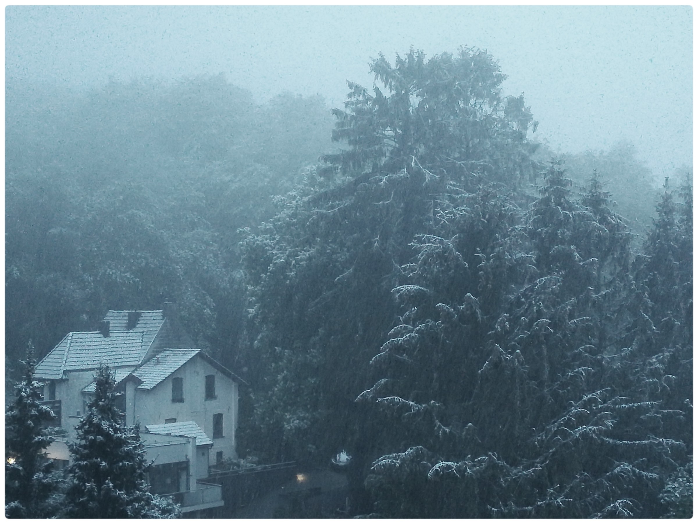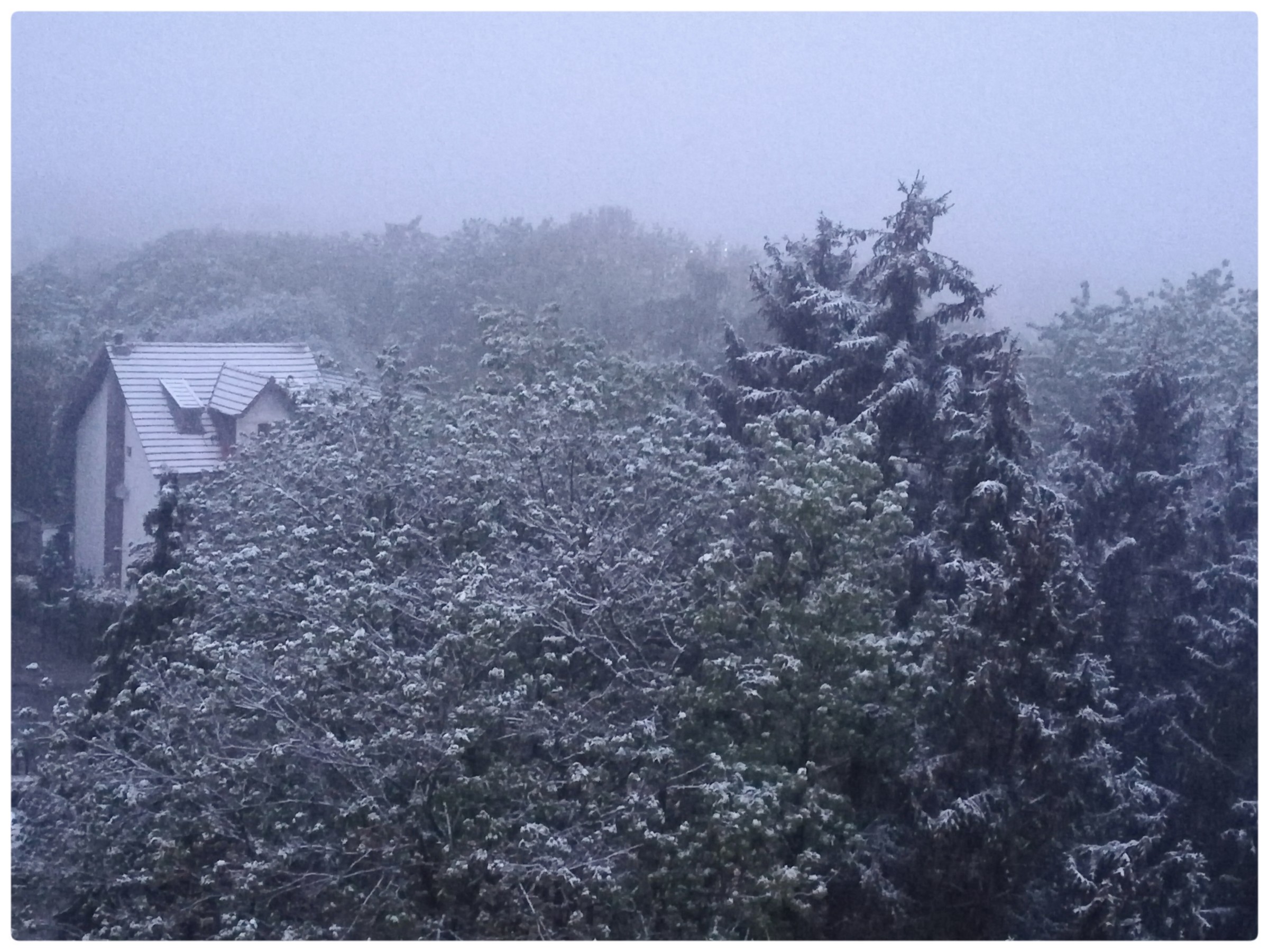 Sinds vanmorgen 4 uur lichte tot matige sneeuwval bij 0.7°. En toch een sneeuwdekje op het Drielandenpunt!