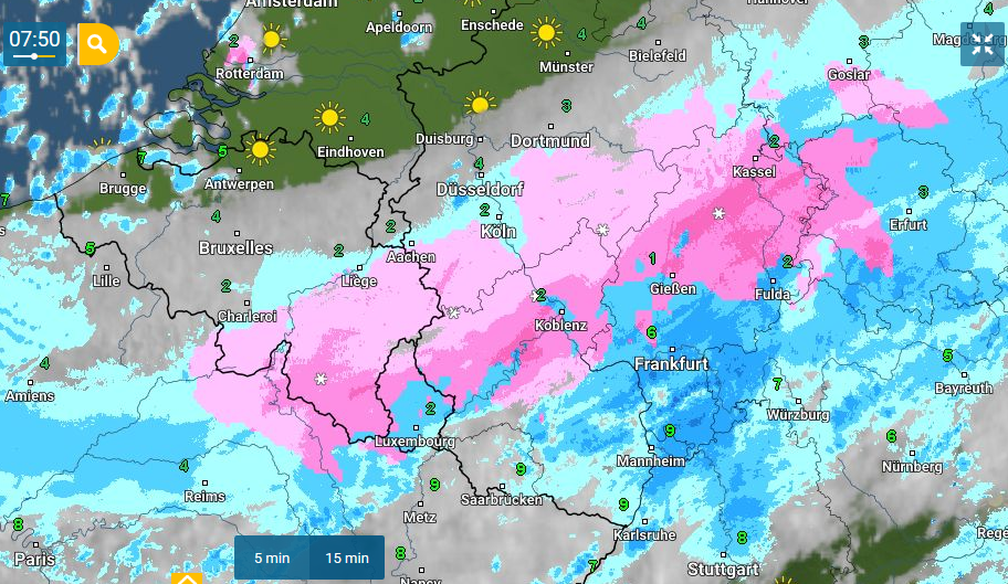 Het gebied met sneeuwval (deels ook natte sneeuw, zoals hier in Wiltz) is nogal fors, zoals op deze afbeelding van Wetteronline te zien is. In de noordelijke helft hiervan is de temperatuur op veel plaatsen ondertussen laag genoeg voor een sneeuwdekje.