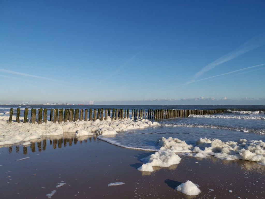 Rondje?Tact 11.8°, matige NO, zonnig en blauw met schuim op het strand
