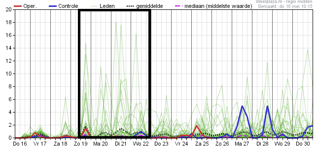 Lijkt heel droog, maar pluim Twente zit cumulatief op 35 mm in 15 dagen, dat is niet weinig, wel is de neerslag tm zondag er vrijwel uit. Dus het schuift op. Ook in de pluim van eind april zat 40 -50 mm, er is hier slechts 12 mm gevallen deze maand tot nu toe, dus veel droger geworden dan het zich volgens de pluim liet aanzien.