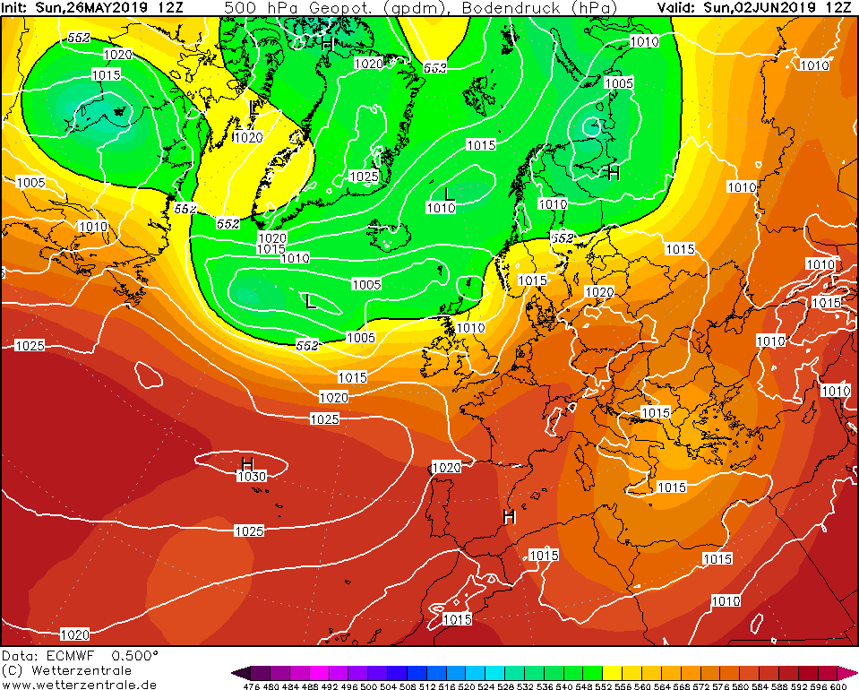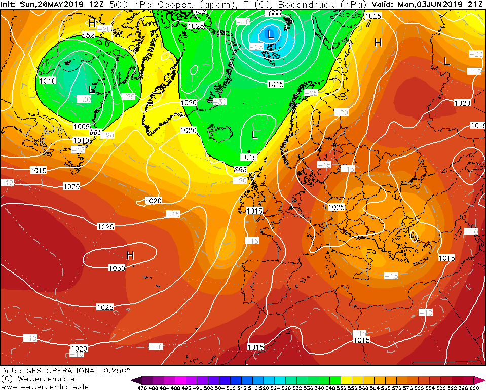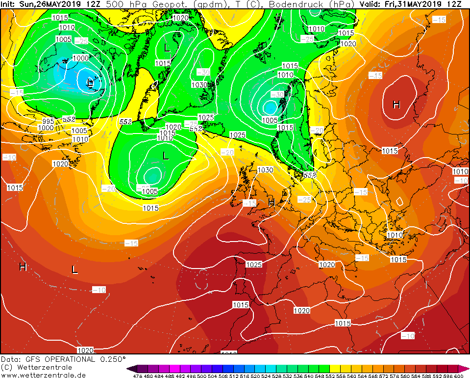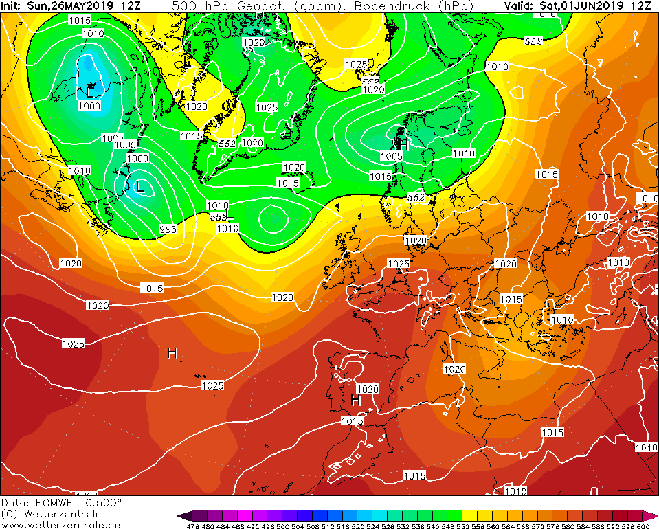 Het houdt de gemoederen al een tijdje bezig, de serieuze eerste warmte opstoot uit Zuid Europa. Op dit moment is het op de meeste plaatsen in ons zomer-brongebied, het Iberisch Schiereiland, al redelijk op temperatuur. De Azoor heeft daar al een paar keer 'uitgehaald' zodat het in hotspots als Sevilla al verscheidene keren warmer dan 36 graden is geworden. Als we naar de Oper kijken zien we dat het Azorenhoog rond 120 aan de wandel gaat en het voor elkaar bokst om zijn vleugels uit te slaan boven de Benelux. Eerder deze lente zagen we dat ook gebeuren maar dan werd de verbinding nog al eens gemaakt tussen IJsland en Groenlandhogen met als gevolg noordenwinden. Dit keer gaat die vlieger niet op aangezien er een depressie bezuiden IJsland rond tolt die een effectieve verbinding onmogelijk maakt. Voor de zomerliefhebber is deze depressie natuurlijk een geschenk uit de hemel want eindelijk kan het ingezette Azorenhoog hoog doorschuiven in oostelijke richting zodat de wind bij ons gaat draaien naar zuidoost, dé richting voor liefhebbers van lange warme avonden, hoge maxima en veel zon. Volgens de meeste modellen gaat dit ook gebeuren, al is er nog veel een hoop onzekerheid over het startsein ervan en hoe lang een warme periode kan gaan duren. Wat in ieder geval vrij zeker lijkt is dat rond 3 of 4 juni de eerste landelijke zomerse dag in de boeken genoteerd kan worden. In juni, betrekkelijk laat voor het NK (Nieuwe klimaat).