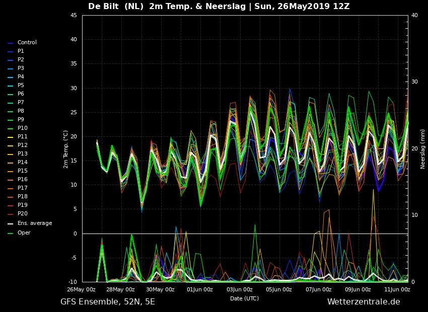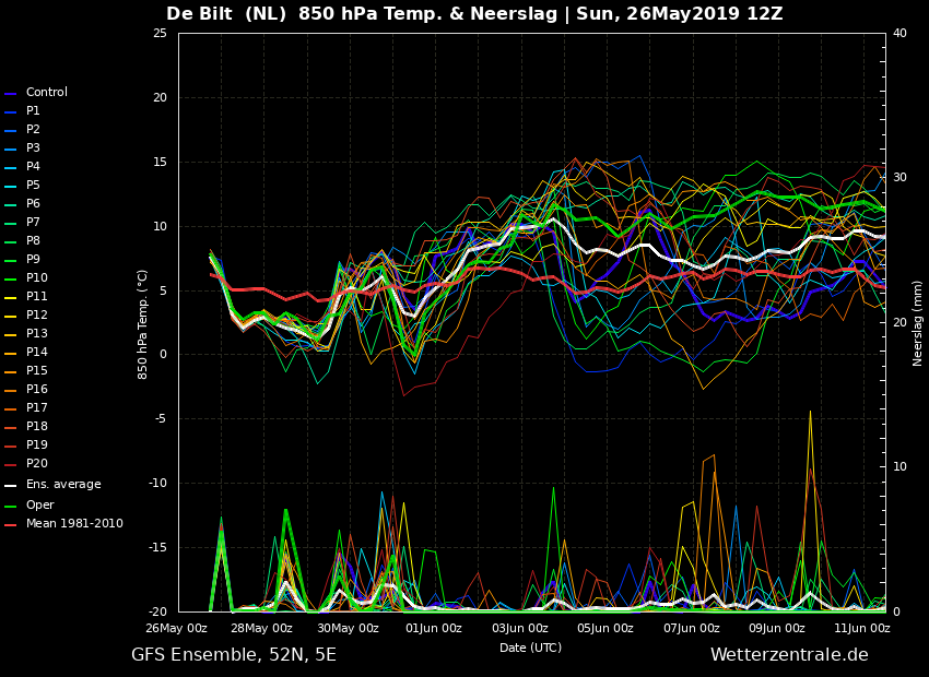 Hoe gaat het verder? Vanaf 4 juni neemt plotseling volgens het jongste ensemble de onzekerheid enorm toe. De meeste leden blijven voor een stabiel weertype gaan maar de temperaturen lopen zeer uiteen doordat de geschetste scenario's ook zeer uiteen lopen. De één komt met een depressie ten westen van ons, de ander met wederom een noordelijke aanvoer. De GFS Oper is voor de zomerliefhebber het fijnst aangezien die een blijvend stabiel en zomers weertype voorschotelt met windrichtingen voornamelijk vanaf het - tegen die tijd - warme continent. Het gemiddelde van het ensemble blijft vanaf het moment van de maandwissel steevast op 20 graden over erboven. Heel aardig weer dus. Helaas wel weer erg droog maar minder droog dan het 06z met wat meer neerslagpieken, ook op LT.