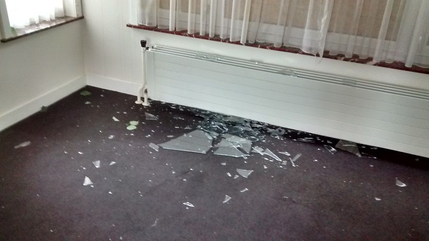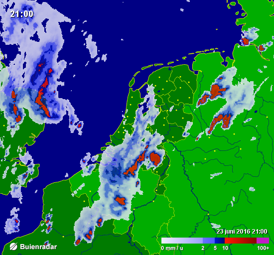 Angstaanjagend noodweer die dag hier in de regio, dit in een junimaand dat hier gekenmerkt werd door extreme hoeveelheden regen. In de avond van 23 juni 2016 naderde vanuit het westen verrassend snel een groen/zwarte wolkenmassa met enorm veel bliksemactiviteit, en letterlijk een ogenblik later beukten enorme hagelstenen tegen mijn woning. Een gigantisch lawaai en ik hield afstand van ramen, aangezien ik vreesde dat die eruitgeslagen zouden worden door de hagelstenen (gebeurde daadwerkelijk op mijn werkadres in Someren, zie onderste foto). Naast die hagel ook enorme regenhoeveelheden en na afloop stond de straat onder water, en waren bomen, auto's en daken van huizen serieus toegetakeld door het noodweer.