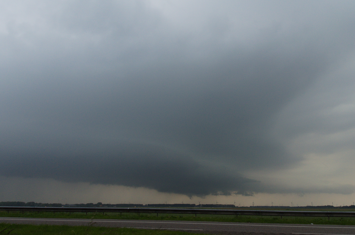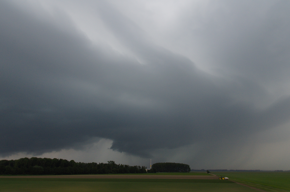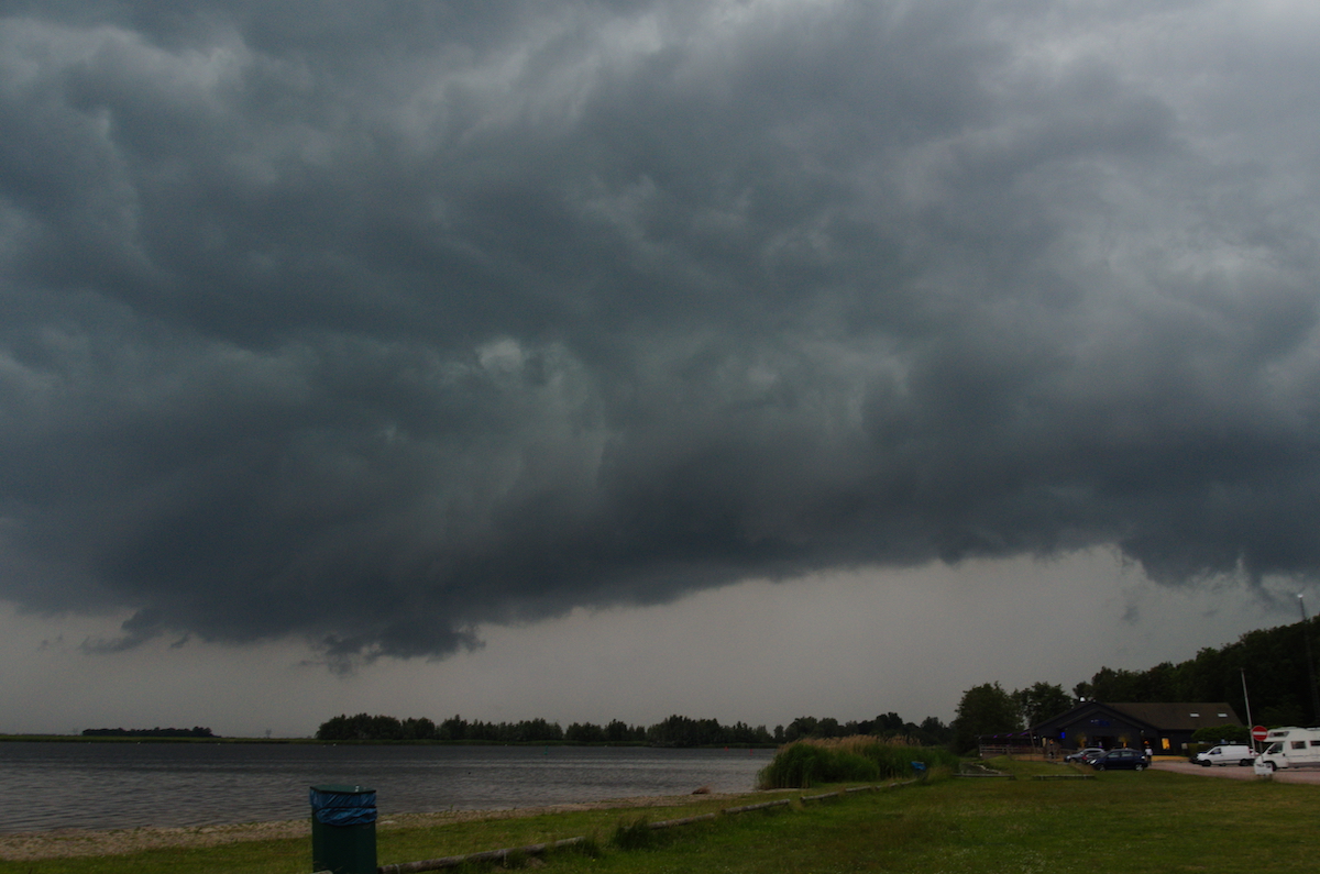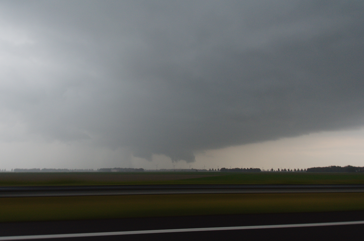 Aan de westkant van Emmeloord hebben we een plek gezocht om alles te volgen. Nu en dan leek het dicht bij een hoos te komen.