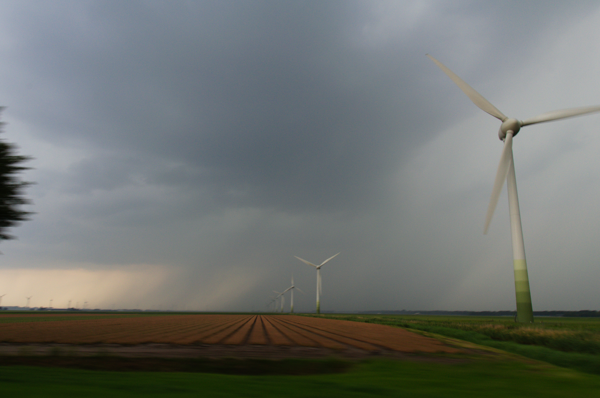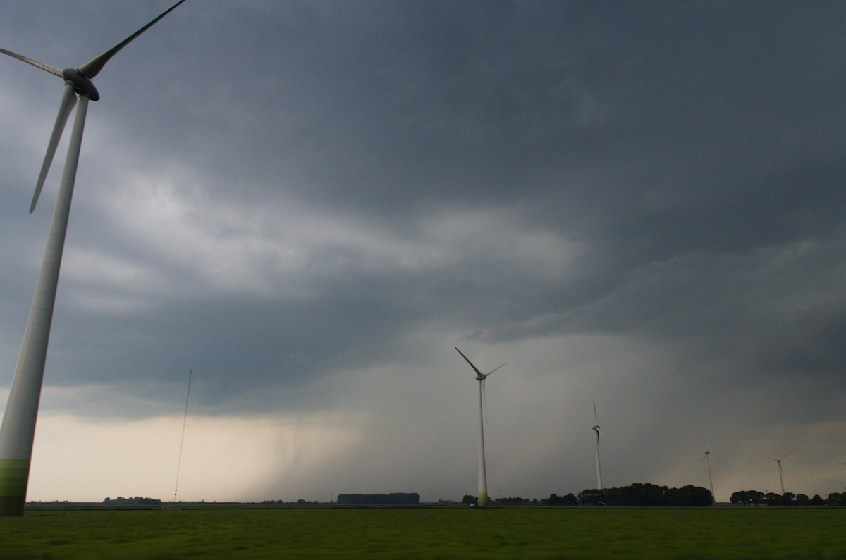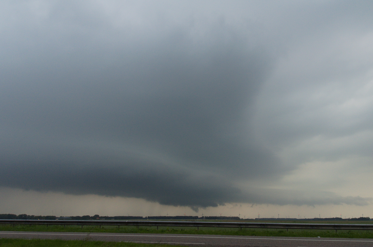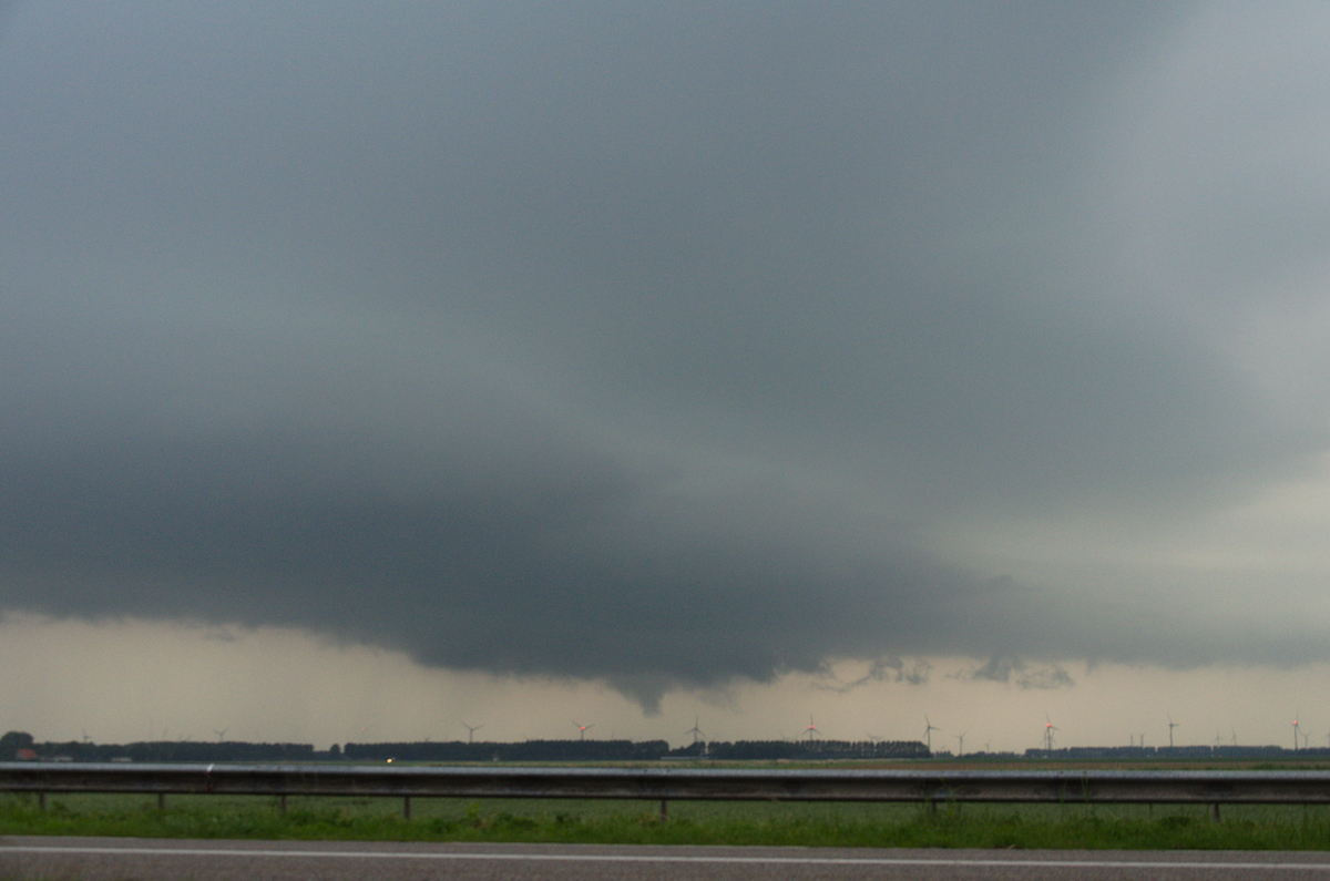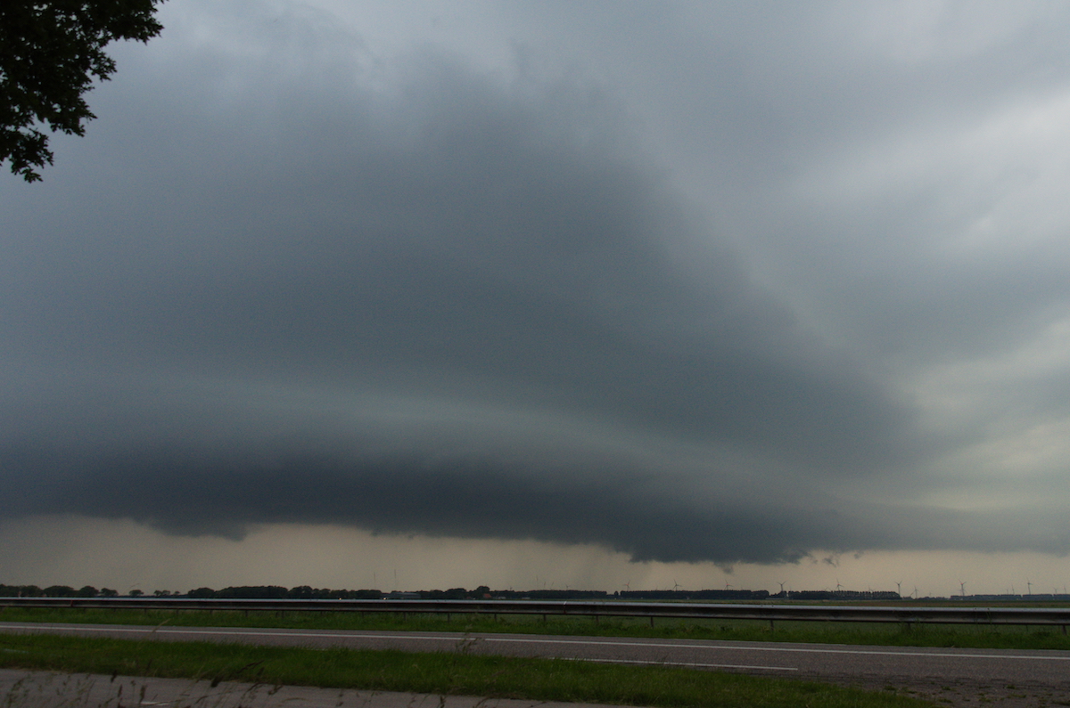 Aan de westkant van Emmeloord hebben we een plek gezocht om alles te volgen. Nu en dan leek het dicht bij een hoos te komen.