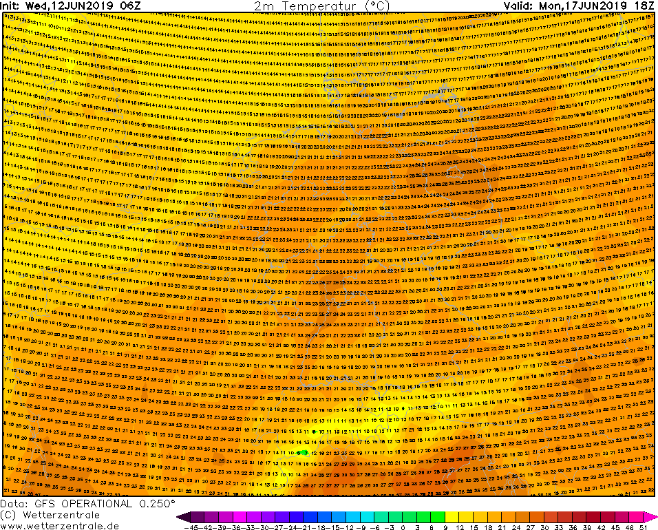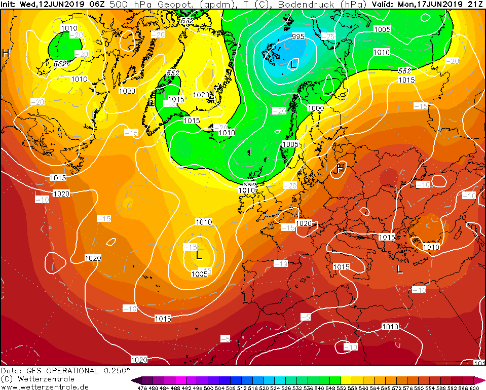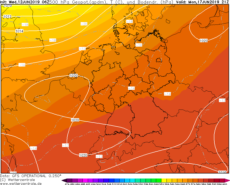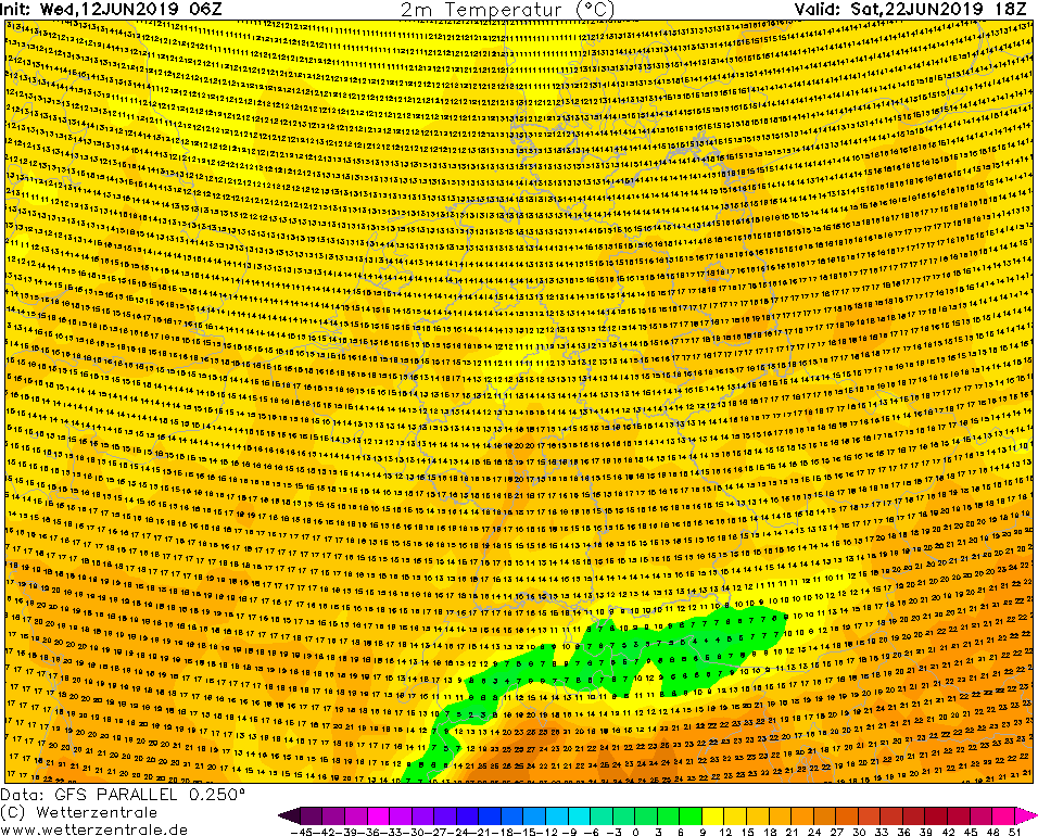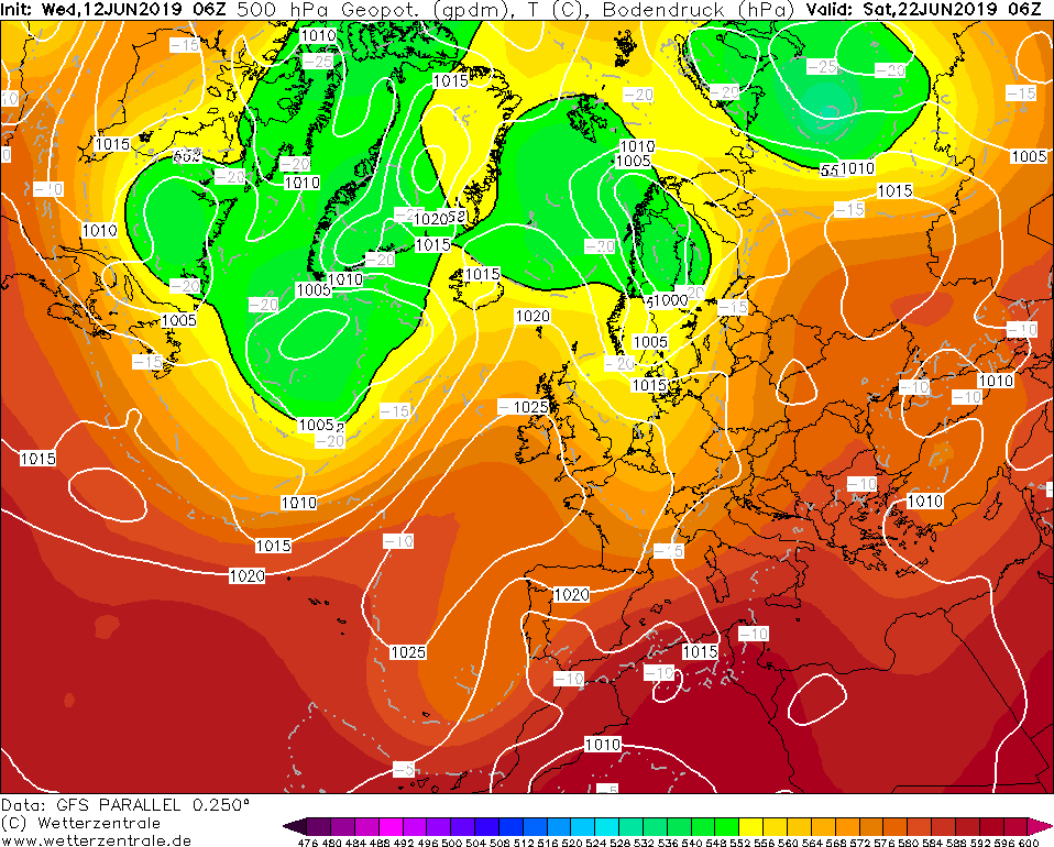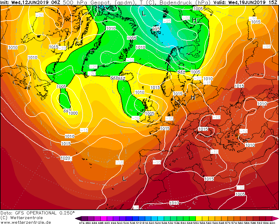 Maar het lukt maar mondjesmaat om de gehele lage landen inclusief de kustgebieden te bestrijken. Dit betekent dat vooral de deze regio's zeer gevoelig zullen blijven voor wind van zee en/of zeewind. Vooral in de namiddag en avond zal de welbekende spekkoekkaart weer boven tafel getoverd worden. Hogedruk blijft daarna zijn best doen en uiteindelijk lijkt het woensdag te lukken om landelijk een zomerse dag te scoren. Wellicht dinsdag ook indien de omstandigheden gunstig genoeg zijn (doch in het noorden in de namiddag al snel wind van zee en forse afkoeling). Daarna komt een depressie toch weer dichtbij genoeg om de warme lucht te verdrijven. Vervolgens zitten we weer in dezelfde situatie met in het binnenland nog aardige maxima maar vooral aan de kust nogal magertjes. Maar zelfs de diepe binnenlanden hebben het met 22 graden dan wel gezien. Het warme tot hete scenario waar de verschillende modellen voor opteerden is dan voorlopig ook weer van de baan.