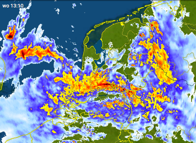 Al zal het natuurlijk niet aan één stuk zo blijven plensen, maar matige regen met af en toe een wat heviger intermezzo lijkt goed mogelijk. Gebied groeit aan de zuidkant aan en beweegt slechts traag naar het noorden toe.