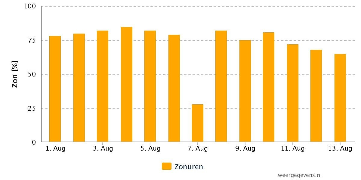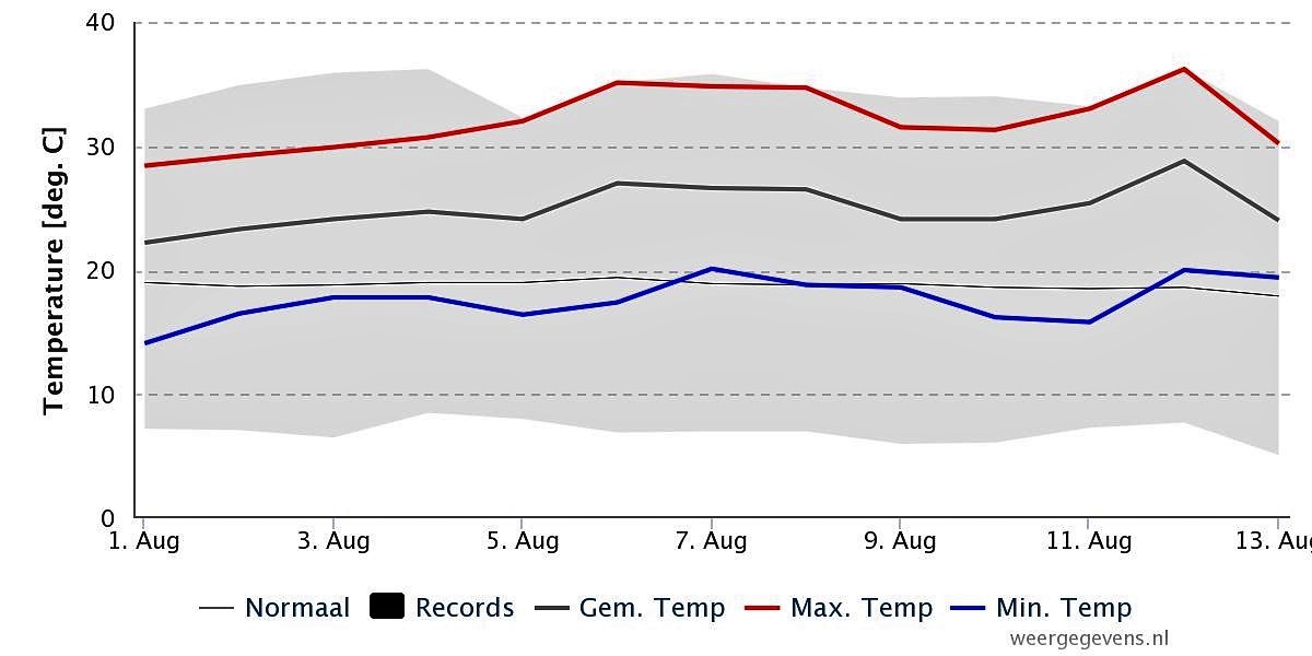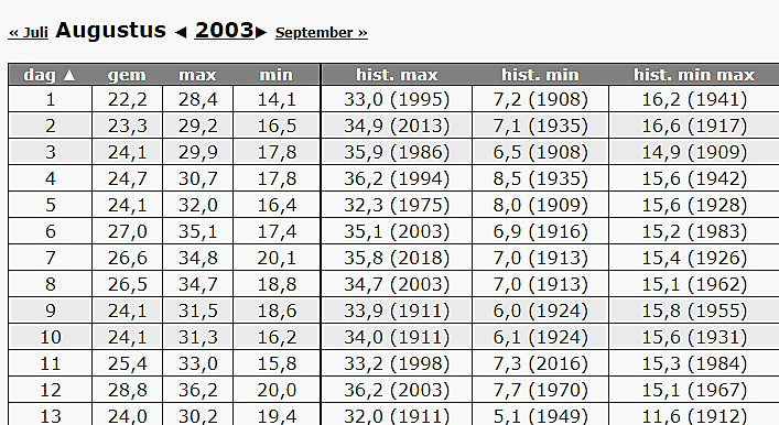 Eerste 13 dagen van augustus 2003. 25 °C etm. avg en 32 °C max avg
