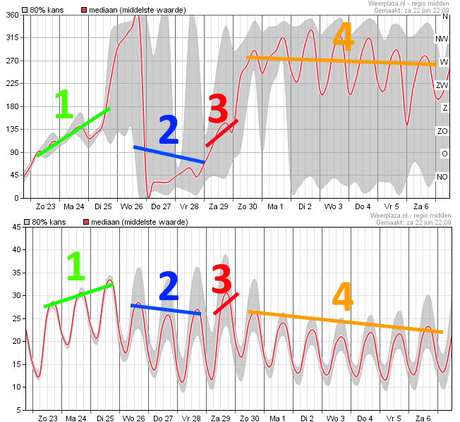 Op microniveau kan het tussen woensdag en vrijdag echt nog alle kanten op: van relatief gematigd (noordenwind) naar bloedheet (zuidenwind). Het blijft vooralsnog echt afwachten, voor definitieve uitspraken is het te vroeg. Generiek kunnen we het volgende zeggen (zoals ik eerder vanavond ook al deed):