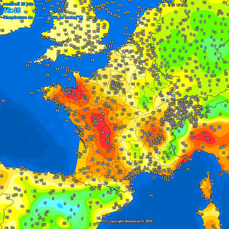 Daarnet wilde ik kijken naar de lage dauwpunten in zuid Frankrijk (want dat was zo verwacht), maar tot mijn verbazing trof ik een kaart met een relatief heel klein gebied met droge lucht, maar elders in Frankrijk juist extreem hoge dauwpunten, tot ruim boven de 25°C ! Zo had Ségur-le-Château om 16 uur een temperatuur van 32,5°C, bij een dauwpunt van 27,7°C, dat geeft een relatieve vochtigheid van maar liefst 76% ! In tamelijk grote gebieden in het westen van Frankrijk, en een gebied in het (zuid-)oosten, komen ook zeer hoge dauwpunten voor. Dat kan gevaarlijker zijn voor de gezondheid, en in feite warmer aanvoelen dan de droge warmte bij 45°C.