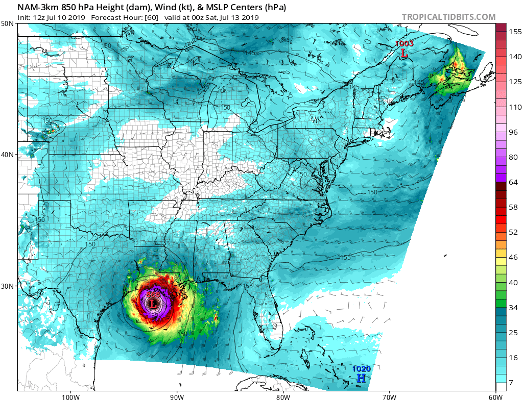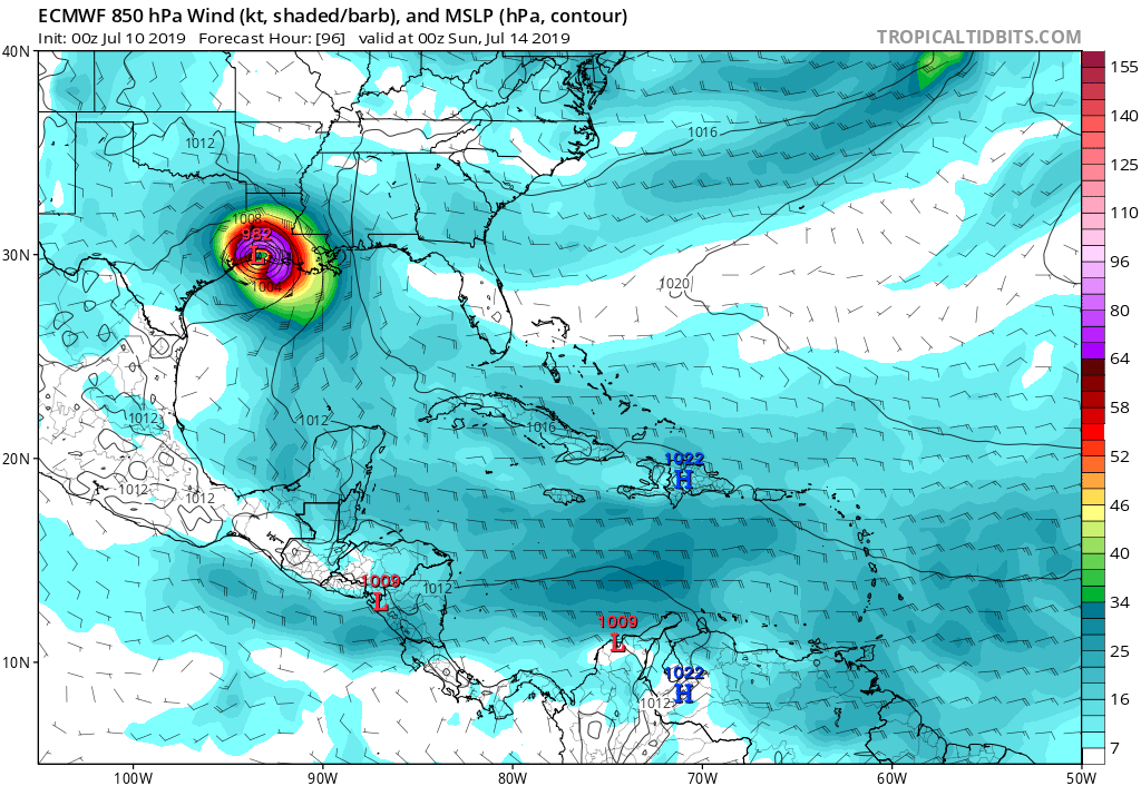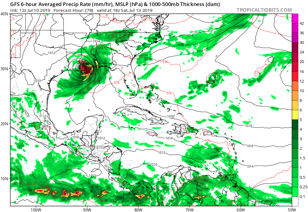 De huidige depressie zal waarschijnlijk zaterdag aankomen in Louisiana, exacte locatie nog onbekend. De modellen zijn de afgelopen 24 uur een stuk heftiger geworden. Een zware categorie 1/categorie 2 orkaan is nog steeds het waarschijnlijkste scenario, aangezien je altijd nog een beetje een slag om de arm moet houden bij plotselingen verschuivingen in modellen. Echter, de orkaan gespecialiseerde modellen komen met een categorie 3/4 orkaan en NAM is helemaal los met een allesvernietigende superorkaan. Dat zal vrijwel zeker niet gebeuren, maar het zijn duidelijke signalen dat de huidige situatie zeer goed in de gaten moet worden gehouden.