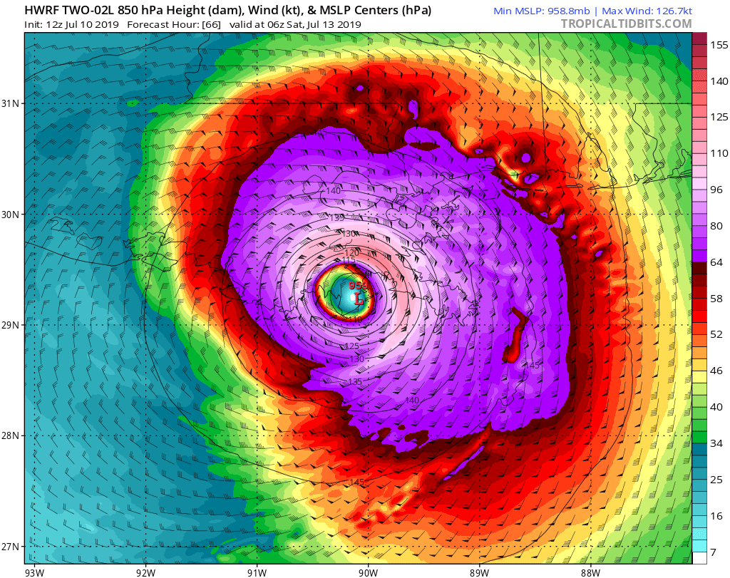 Echter, het kan misschien nog veel slechter uitpakken. HWRF, het meest gerespecteerde, best scorende en gespecialiseerde orkaanmodel is veel verandert de afgelopen 24 uur en komt nu met een kerndruk van 959 hPa met windsnelheden tot 230 km/h! (125 knots), een categorie 4 orkaan. Het is nog allemaal afwachten, maar dit zou een enorm uitzonderlijke situatie zijn als het uitkomt.