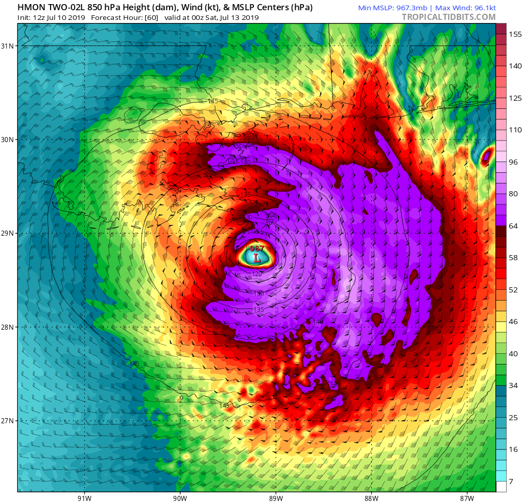 Het tweede meest gebruikte orkaanmodel, HMON, is vergelijkbaar met HWRF qua luchtdruk (ook al is de windsnelheid iets lager). Meestal is een verwachting vrij zeker als HMON & HWRF het eens zijn, maar aangezien EC en GFS wel iets minder extreem zijn vind ik het nog een beetje onzeker. HMON komt met een kerndruk van 967 hPa bij aankomst met windsnelheden tot 178 km/h (96 knots).