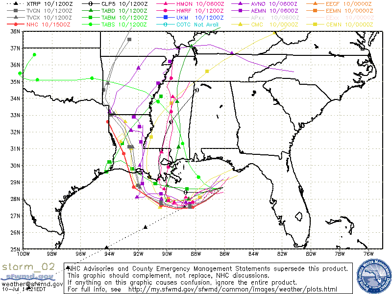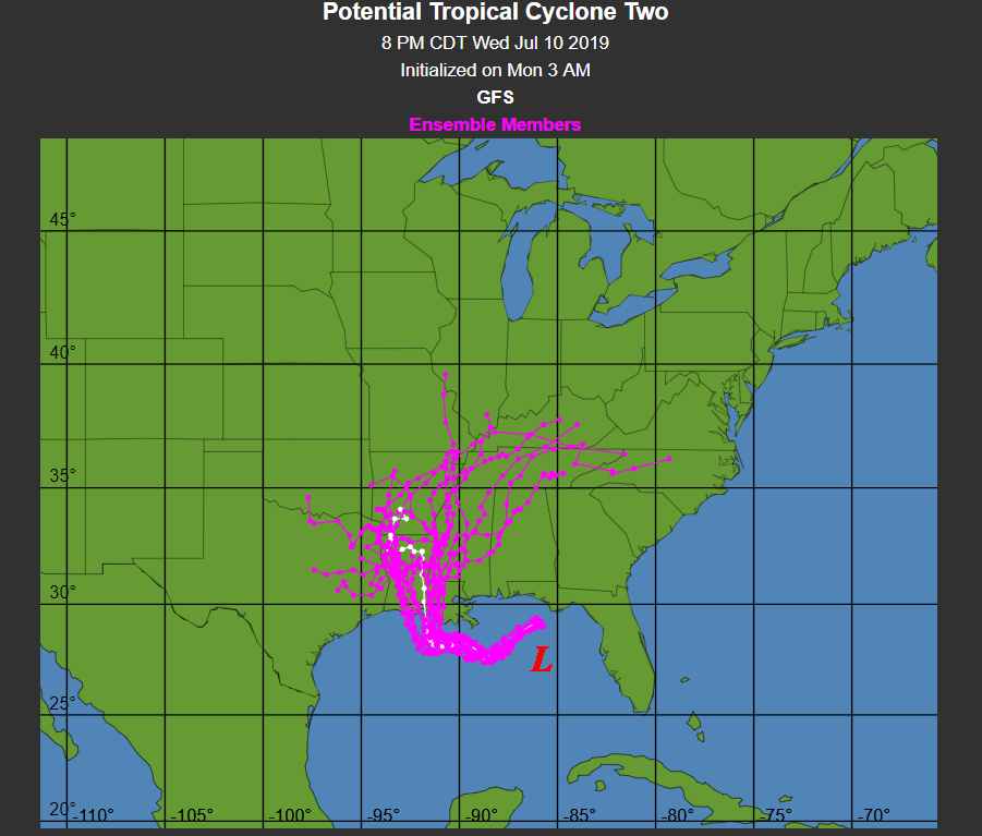 Het GFS ensemble laat duidelijk zien dat Louisiana zeer waarschijnlijk de plek van aankomst zal worden. Alleen NAVGEM komt nog met aankomst nabij Houston, maar dat is nu zeer onwaarschijnlijk kijkende naar de andere modellen.