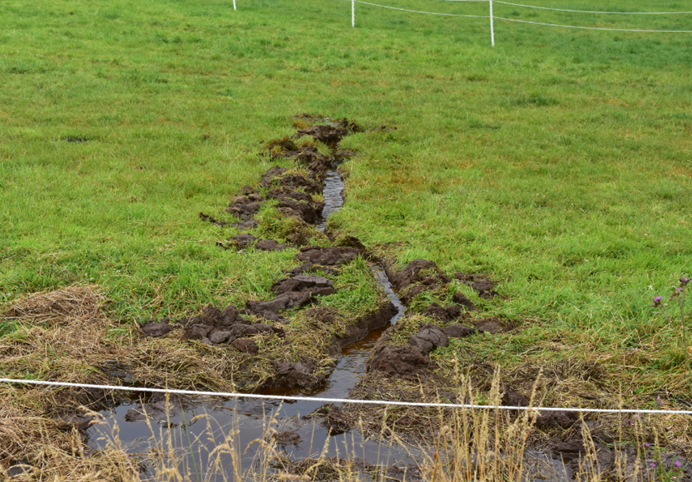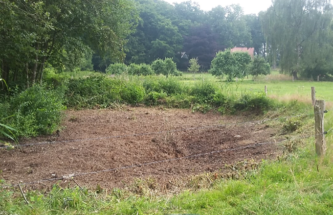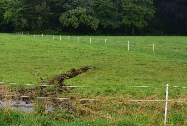 Een sloot scheidt ons weiland, echter maaien we deze sloot nooit. Geen enkele omdat het juist goed is voor de flora en fauna en voor het vasthouden van water. Tijdens de bui heb ik een geultje gegraven zodat het water in ons weiland loopt, en niet via de sloot zomaar weg! Het water zal rustig in de bodem weg trekken omdat het nu geen kant op kan (weiland is daar een kommetje).