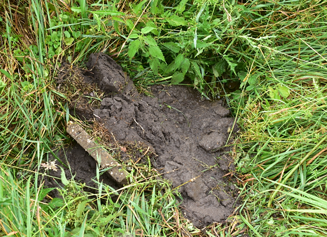 Een tegel voor de duiker en goed wat zand ervoor, en dit in de stromende regen. al het water spoelt op deze manier niet weg via de sloot, maar stroomt regelrecht de kurkdroge poel in! Nu staat er zo'n 40 cm water in.