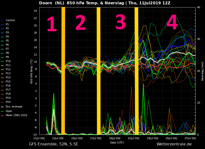 4) Hogedruk neemt het heft weer in handen, precieze positionering onduidelijk. Trend gaat richting droger met bovengemiddelde temperaturen. Met zo'n uitgezakte trog ten westen is er potentieel kans op warmte vanuit het zuiden, zoals we in juni zagen. Maar goed, veel te ver weg natuurlijk