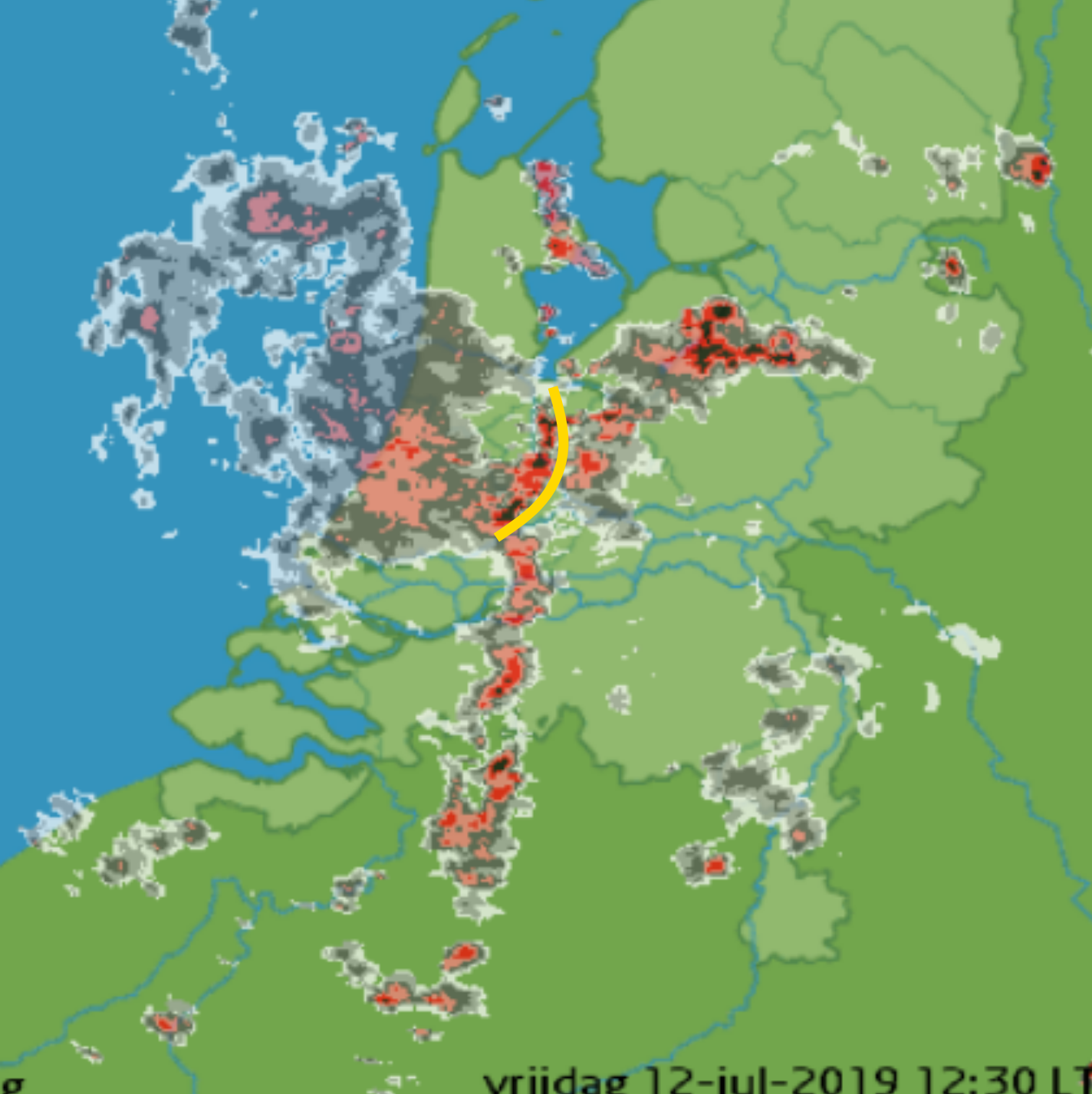 Ten westen van de stad een flinke buienlijn in aantocht met veel onweer. Als je die over je heen krijgt plenst het even lekker door.
