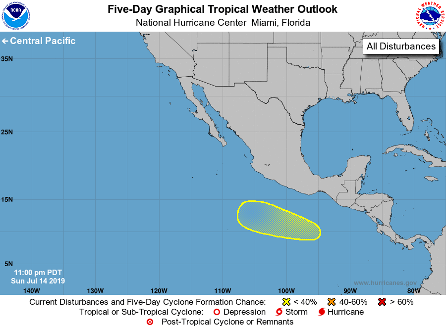 In de Pacifische Oceaan is momenteel een disturbance met slechts een 20% kans van vorming in de komende 5 dagen. Bij GFS komt de disturbance niet lager dan 1001 hPa en vormt hij zichzelf nooit echt als een storm. EC en ICON zien er ook niet veel in en bovendien is er in de officiële orkaanmodellen HWRF en HMON niet echt orkaanvorming te zien.