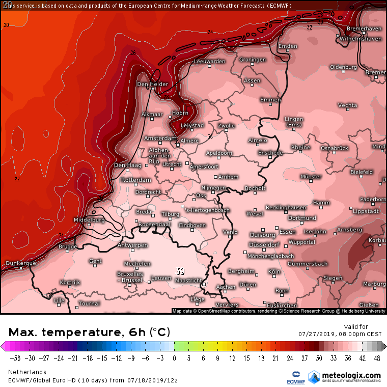 Tx: Zaterdag 39°C boven de zandgronden in het ZO