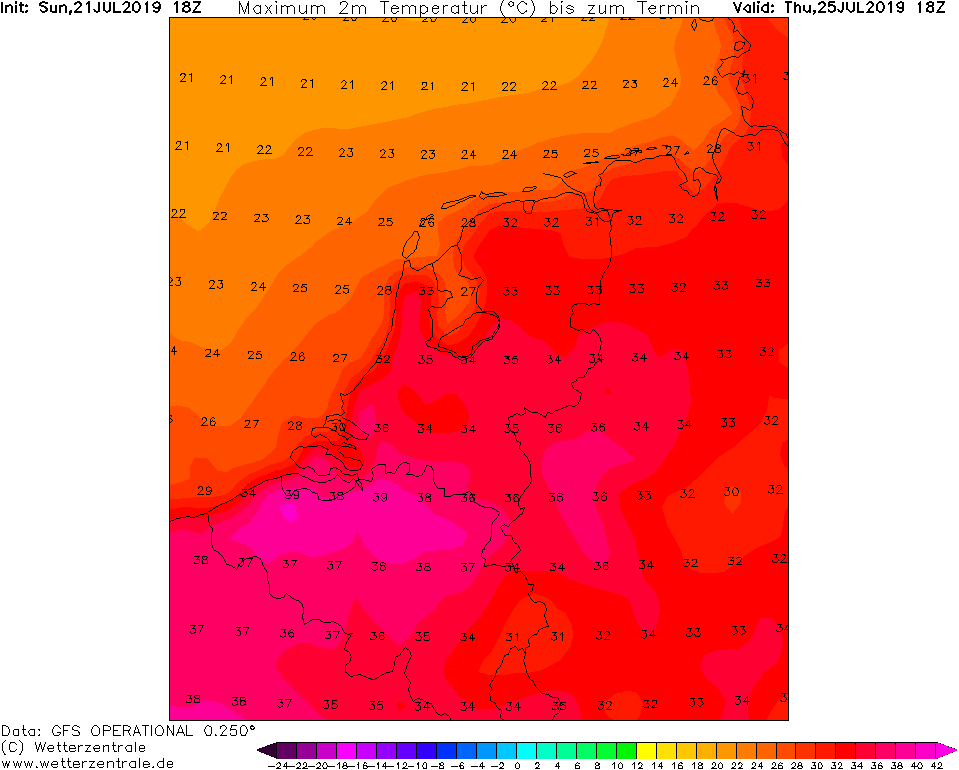 Zoals je ziet zijn Noord-Brabant en Limburg iets minder heet dan in de andere modellen. Ik weet niet precies waarom, volgens mij was GFS de afgelopen runs elke keer iets minder heet in de regio en lag de nadruk steeds op Zeeland. In de andere modellen is daar minder steun voor en ligt de nadruk meer op het Zuiden/Zuidoosten. Om eerlijk te zijn zou niet precies weten waarom dat zo is.