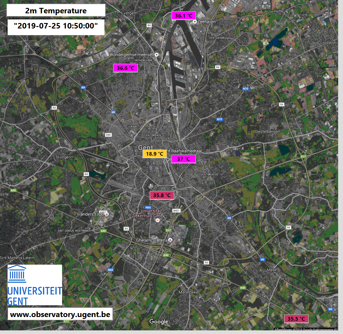 Momenteel 'grote' verschillen in Gent, waar de Gentse Feesten zijn al 37°C gemeten om 12u50.