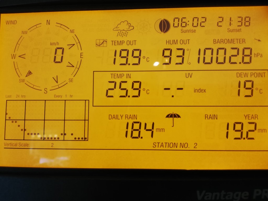 Tact 19.6°, WNW 1 Bft, matige regen en 16 mm