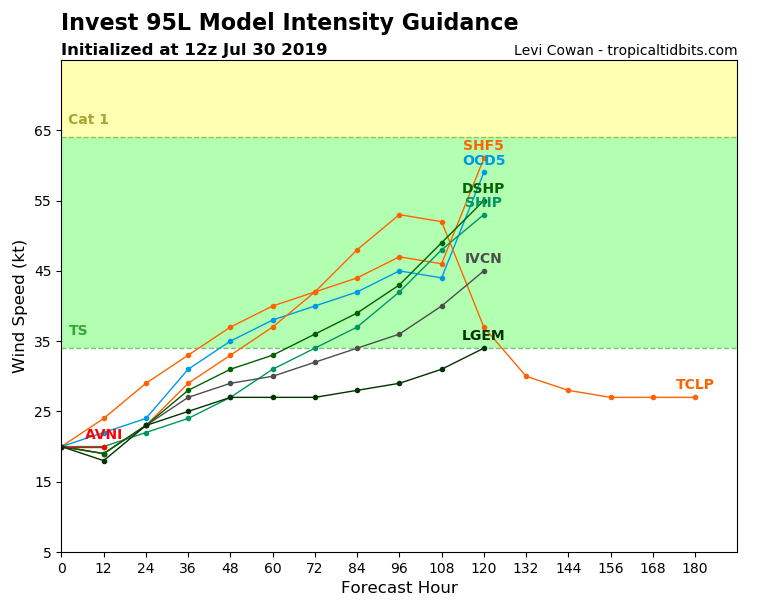 Ten Zuiden van de Dominicaanse Republiek bevindt zich op dit moment een disturbance met een vormingskans van 10% gedurende de komende 5 dagen volgens NHC. GFS en EC laten geen duidelijke orkaanvorming zien, ICON komt wel met een zeer lichte depressie (1008 hPa) die Florida op 3 augustus schampt. Het zal allemaal op kleine details aankomen en daarom is het handig om te kijken naar de modellen die specifiek voor deze regio zijn gemaakt. Gelukkig komt daar Tropical Tidbits weer langs en krijgen we de prachtige overzichten hieronder die laten zien die wel degelijk laten zien dat er potentie is voor een tropische storm, ook al is een orkaan vrijwel zeker uitgesloten. Cuba kan dan rond 4 augustus (+120 uur) last krijgen van de tropische storm. Het pad van de storm is erg onzeker, Nhc geeft in tegenstelling tot bijvoorbeeld ICON ten Noorden van Haïti aan en dan kunnen Bahama's last krijgen van de storm. Tegen de tijd dat Florida wordt bereikt, is het systeem al vrijwel volledig verdwenen volgens deze modellen. Al met al, denk ik dat de 10% van Nhc iets aan de lage kant zit, maar ook ik verwacht niet veel van deze disturbance.